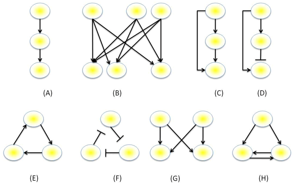 The genes within a network may be visualized as directed graphs containing a set of nodes, representing the genes, protein and/or metabolites, connected by a set of edges, which represent the interactions between these nodes. The number of edges that belongs to a node is its degree, and the distribution of the number of edges across networks is the degree distribution. Intuitively it may be assumed that the degree distribution would approximate a Poisson distribution, however, conversely they tend to approximate a power-law distribution, where most nodes are sparsely connected and a small number has a much larger degree [,]. When auto-regulation of genes is not permitted, the maximum number of edges within a network of size N must necessarily be N(N-1) edges, however, many genes do regulate themselves as in single-gene positive or negative feedback loops. Expression data obtained from technologies such as Yeast 2-Hybrid, ChIP-chip or ChIP-Seq can provide relationships such as correlative relationships between sets of expression data. The resultant expression data can be processed by software and mathematical models can be inferred (reviewed in [,]). An interesting paradigm emergent from this data is the existence of common network topologies that are observed across different taxa and even different types of networks (i.e., non-GRNs). This paradigm was first observed by Milo et al. [,] who generated null distributions of network sub-graphs through randomizing the edges of networks with the same degrees, and selected motifs that were found to be in numbers significantly higher than at random []. A follow up study used z-scores to calculate a significance profile for comparison of network local structure when compared with random structures []. Both studies found commonly occurring motifs not only within transcriptional networks, but also within protein-signaling networks, neuronal networks and non-biological networks, such as those found in social networks, power-grids and within the World Wide Web. These methods did receive some criticism, however. For example, it was stated that C. elegans neuronal pathways are spatially dependent with networks being formed between spatially closer nodes and that these spatial dependencies were not included by Milo et al. in their network inference []. Common examples of the motifs observed are illustrated in Figure 3. These include the single and multi-input modules, the positive feedback loop, the negative feedback loop, the three-cycle positive feedback loop, the feed-forward loop (FFL) and the bi-fan motif.