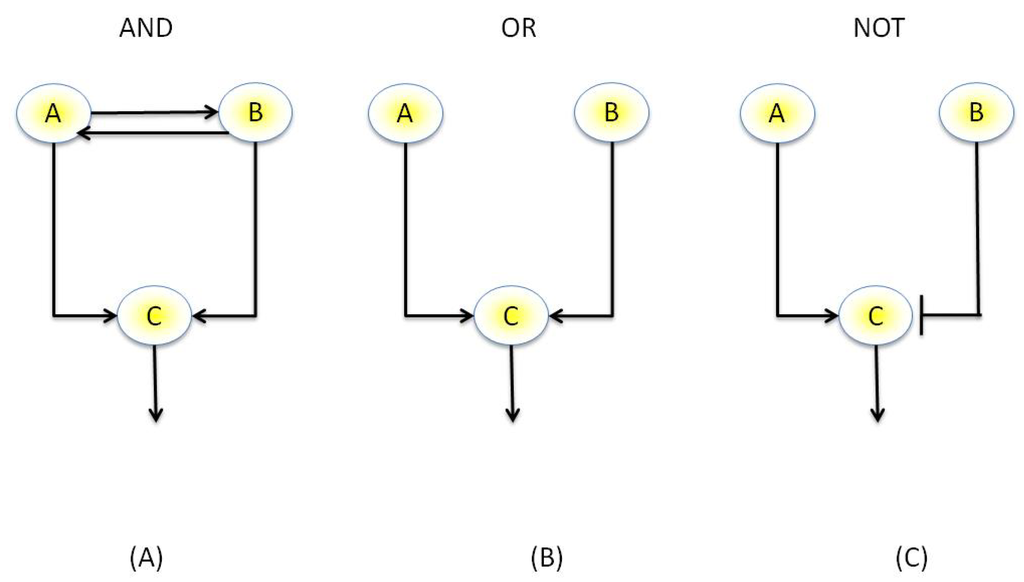 Example of a Boolean network. (A) AND motif: Genes A and B co-regulate each other, therefore Genes A and B must be active to activate Gene C (B) OR motif, either Gene A or B is sufficient to activate Gene C (C) NOT motif: Gene B down-regulates Gene C, therefore must be “off” to allow activation of Gene C.