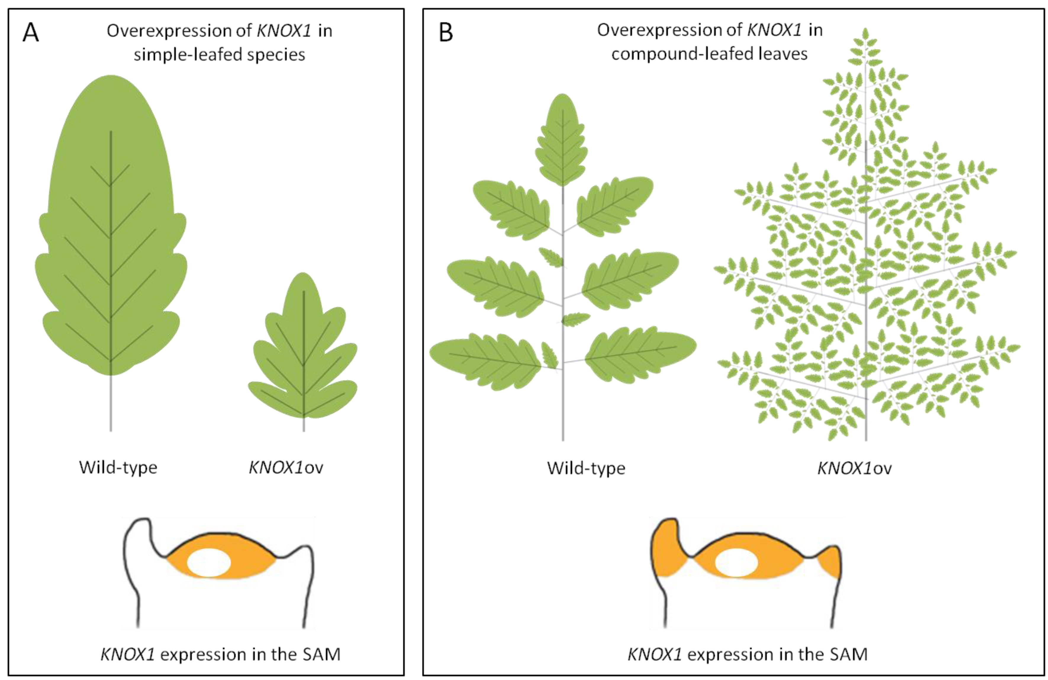 Overexpression of KNOX1 genes in plants with simple or compound leaves. Schematic representation of the lobed leaf phenotype of Arabidopsis plants that overexpress KNOX1 genes (A) or the supercompound leaf phenotype due to KNOX1 overexpression in tomato (B). In the lower part of the panels the expression of KNOX1 genes in the shoot apical meristem (SAM) of plants with either simple (A) or compound (B) leaves is schematized. KNOX1 expression domains are shown in orange.