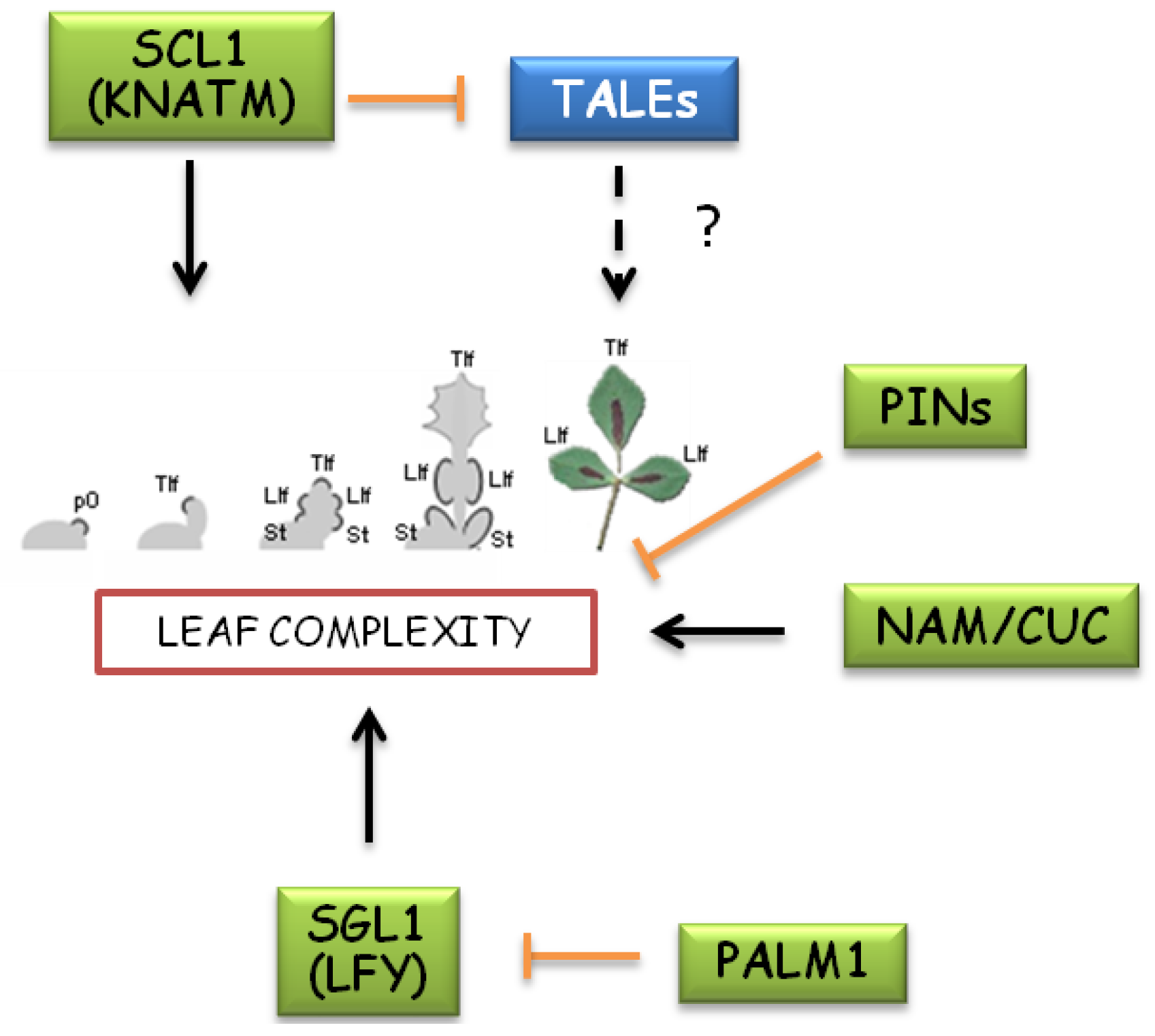 Genetic pathways involved in compound leaf development of Medicago truncatula. Leaf development in IRLC clade of legumes, including Medicago genus, seems to involve pathways alternative to KNOXs. M. truncatula mutations affecting leaflet number identified homologs of Arabidopsis LFY, CUCs and KNATM as genes promoting leaf complexity. A novel Cys(2)His(2) zinc finger transcription factor (PALM1) acts as a repressor of SGL1/LFY to reduce leaf complexity. Differently from Cardamine hirsuta, mutations in PIN-like genes result in increased formation of leaflets. The role of TALEs in Medicago leaf morphology remains unclear due to conflicting data regarding detection of mRNA in developing leaves and the effect of KNOX1 overexpression on leaf complexity.