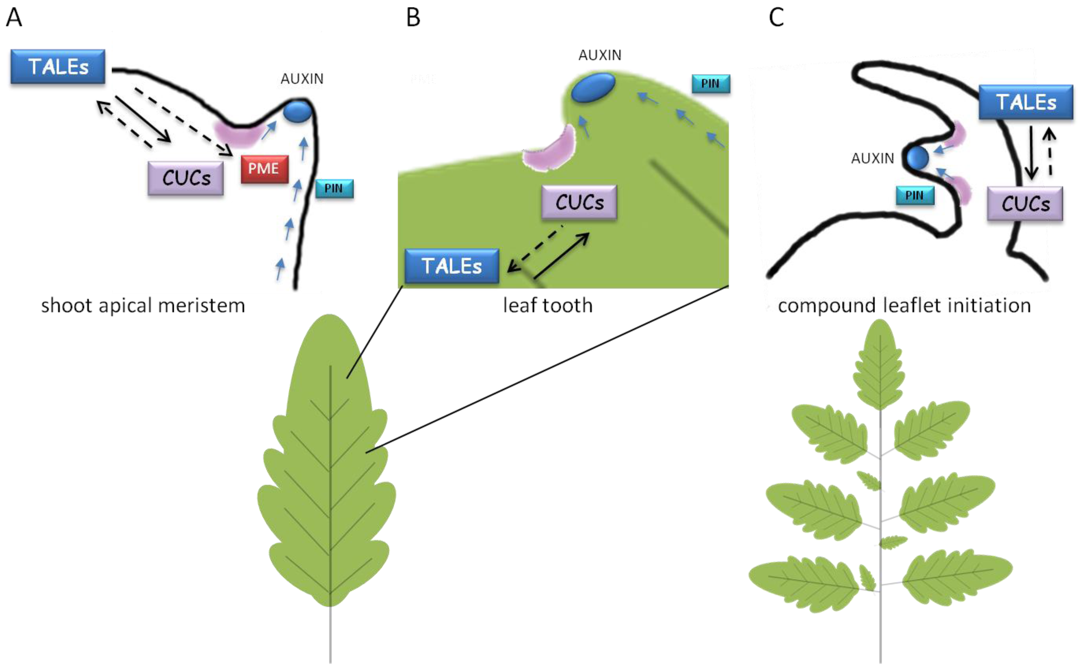 Common genetic pathways involved in lateral organ formation at the SAM (A), formation of leaf serrations (B) or leaflets in compound leaf development (C). PIN1-dependent auxin transport (blue arrows) leads to formation of auxin maxima (blue smarties) for organ/tissue outgrowth. Localized CUCs expression (in purple) and a positive feedback loop between CUCs and TALEs are required for setting boundaries and proper organ separation. TALE would maintain the indeterminate environment for morphogenesis whereas auxin and CUCs would ensure organ/tissue patterning and separation. In the SAM, TALEs would repress PME expression to prevent cell expansion. Continuous or discontinuous black arrows indicate either direct or indirect induction, respectively.