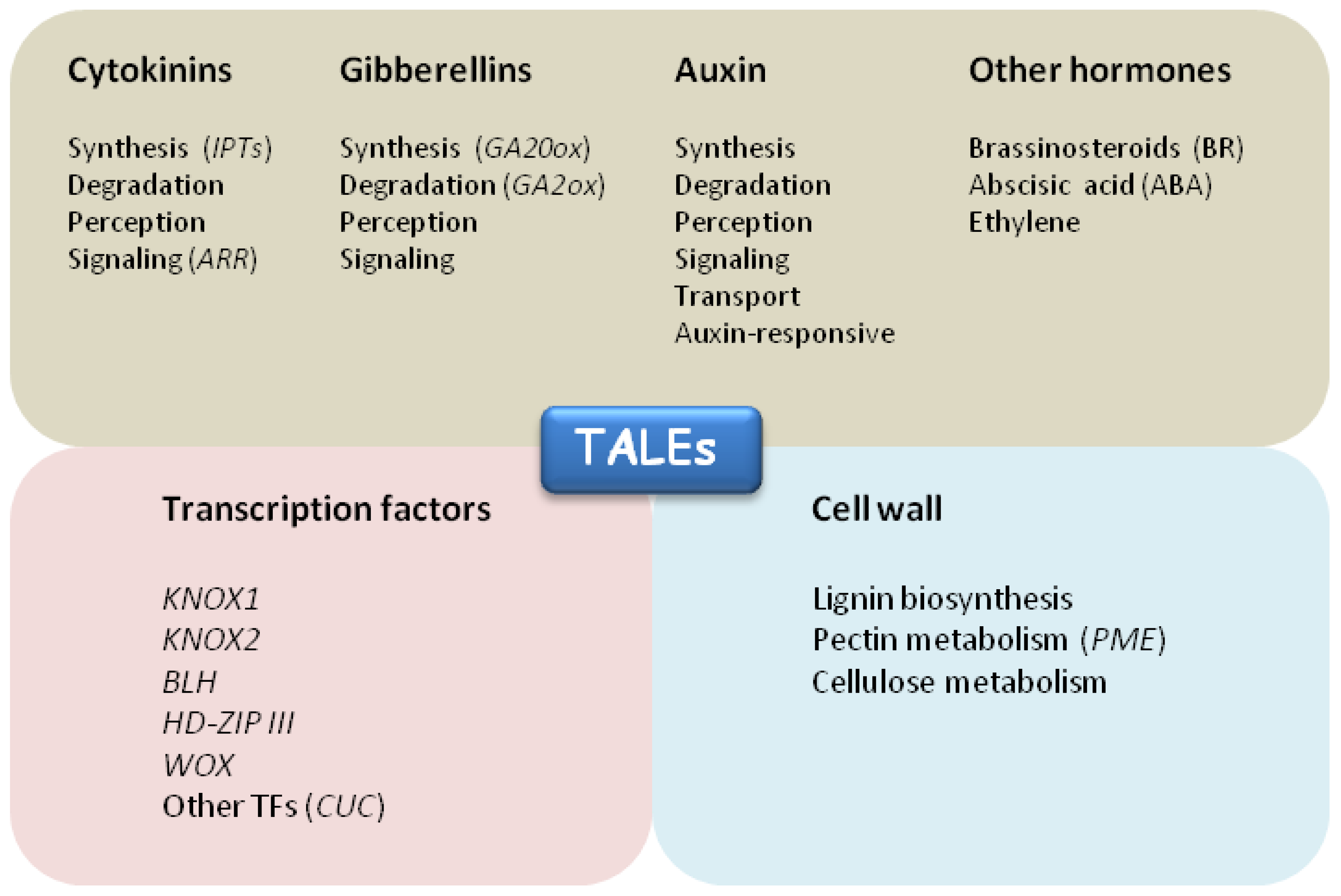Functional categories of TALE target genes. Putative TALE direct targets belong to three main functional categories: hormonal pathways (grey box), transcriptional regulation (pink box) and cell wall metabolism (light blue box). KNOX1 positively regulate cytokinin biosynthesis and signaling through induction of ISOPENTENYL TRANSFERASE (IPTs) and ARABIDOPSIS RESPONSE REGULATORS (ARRs) genes. Low active gibberellins levels are maintained by KNOX1 through repression of GA biosynthetic genes (GA20ox) and induction of GA degradation by GA2ox genes. CUC1 TF has been identified as a direct target of STM in Arabidopsis. Arabidopsis KNAT1/BP was shown to repress several genes involved in lignin biosinthesis. Arabidopsis BLH9/BLR negatively regulate PECTIN METHYLESTERASE 5 (PME5) gene to repress cell expansion in the SAM. Recent studies of ChIP-seq and RNA-seq identified KN1 modulated and bound genes enriched in TFs and hormone metabolism, most notably auxin.