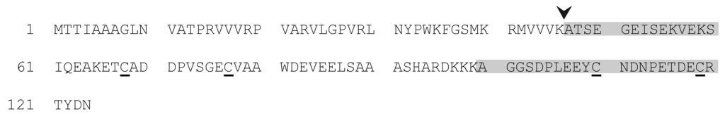 Deduced amino acid sequence of Arabidopsis CP12. Grey bars indicate peptides found by tandem mass spectroscopy that matched to this protein. An arrow indicates the potential cleavage site of the transit peptide [24]. Four conserved Cys residues of CP12 are underlined.