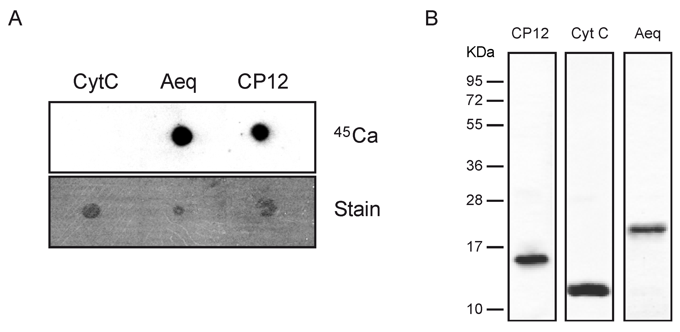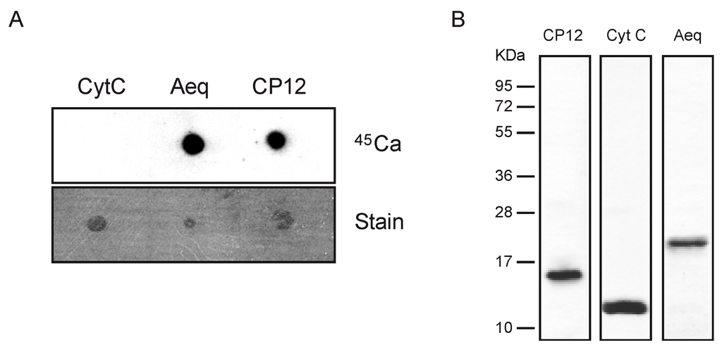 To validate whether CP12 is indeed a calcium-binding protein, a calcium overlay assay was performed with recombinant protein (Figure 3). The mature protein, without targeting peptide, was cloned into the pTWIN1 vector and purified from E. coli under native conditions. The well-established calcium-binding protein aequorin (Aeq) and cytochrom C (CytC) were used as positive and negative controls, respectively.