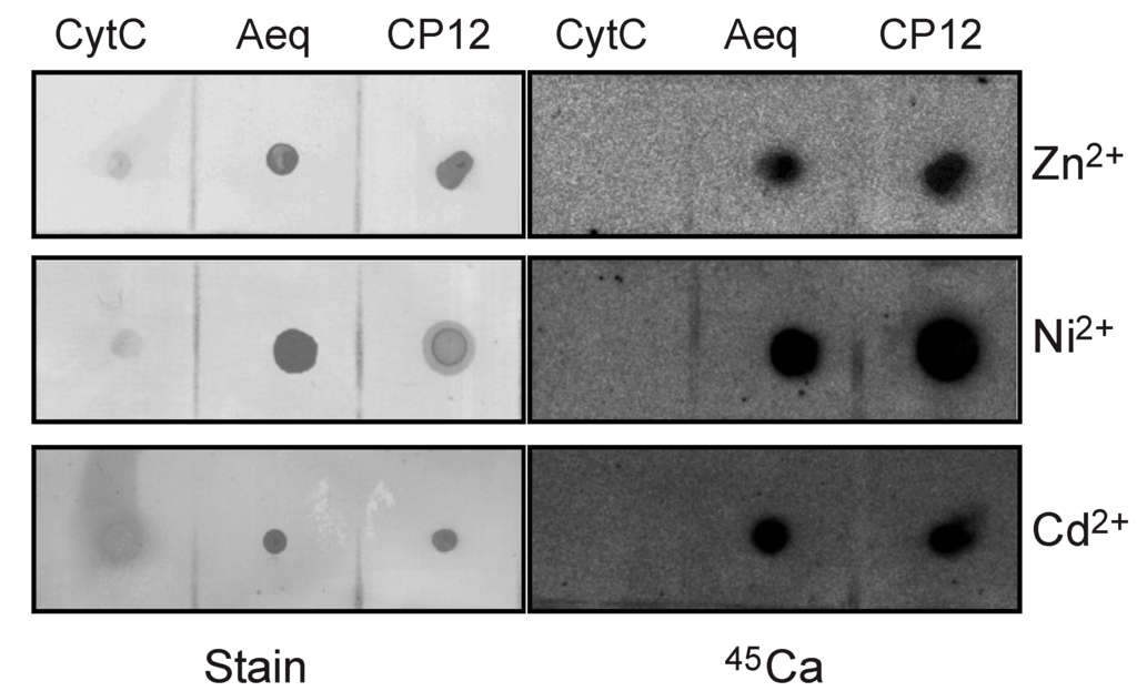 Calcium competition assays with other divalent cations. Autoradiogram of calcium-overlay assay using recombinant CP12. In addition to 45Ca, buffers contained either 0.1 mM zinc acetate (Zn2+), nickel sulphate (Ni2+) or cadmium acetate (Cd2+). Aequorin (Aeq) and cytochrome C (CytC) were used as positive and negative controls, respectively (right panel). Two µg of each protein were spotted onto a PVDF membrane and post stained by coomassie brilliant blue (left panel).