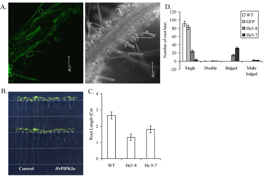 Arabidopsis plants expressing GFP-HsPIPKIα (Hs5-6, Hs5-8, Hs9-7) have shorter roots than the control plants (WT and GFP expressing plants). (A) GFP-HsPIPKIα localized with the plasma membrane in the root. Transgenic HsPIPKIα seedlings were imaged using a confocal microscope. Left panel shows fluorescence and right panel shows the differential interference contrast image. Bars = 100 μm; (B) 10-d-old HsPIPKIα seedlings grown on MS media have significantly shorter roots; (C). Plates were photographed and root growth was measured using Adobe Photoshop and analyzed using Microsoft Excel. The data are the mean of at least 10 seedling measurements per line ± SD. (D) The number of single, double, bulged and multibulged root hairs in 7-d-old wild-type and HsPIPKIα seedlings were determined. The data are means of 24 seedlings per line ± SE.