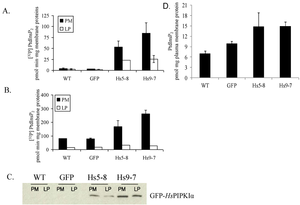 The HsPIPKIα 9–7 lines had a more pronounced bulged root hair phenotype (Figure 2D) and the highest PIP 5-kinase activity (Figure 3A). Plasma membranes were isolated from young seedlings and leaves of 1 month-old plants, and PtdInsP 5-kinase specific activities were measured in vitro. Exogenous PtdIns(4)P was added to the reaction mixture so that the substrate would not be limiting. Expression of the HsPIPKIα in Arabidopsis increased the production of [32P]PtdIns(4,5)P2 15 to 25-fold more in young seedlings and 2 to 3-fold more in 1 month-old plants compared to WT and GFP lines (Figure 3A,B). As indicated by the in vitro assays (Figure 3A) and immunoblot of isolated proteins (Figure 3C), GFP-HsPIPKIα was recovered primarily in the plasma membrane (upper phase) that was separated by aqueous two-phase partitioning.
