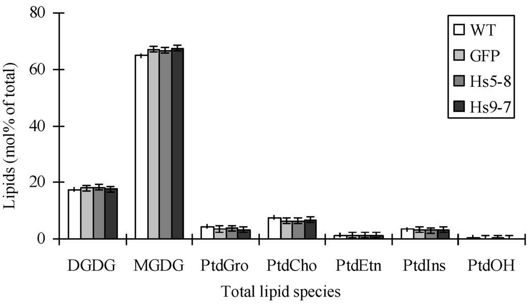 In order to determine if the increased PtdIns(4,5)P2 changed the major phospholipids in HsPIPKIα seedlings, total lipids were extracted as described in the Experimental Section. The major composition of the phospholipids, such as PtdGro, PtdEtn, PtdIns, PtdCho, PtdSer and PtdOH, and galactolipids, such as MGDG and DGDG, was not significantly different between WT, GFP and HsPIPKIα plants (Figure 4; the data are presented in Supplemental Data File 1).