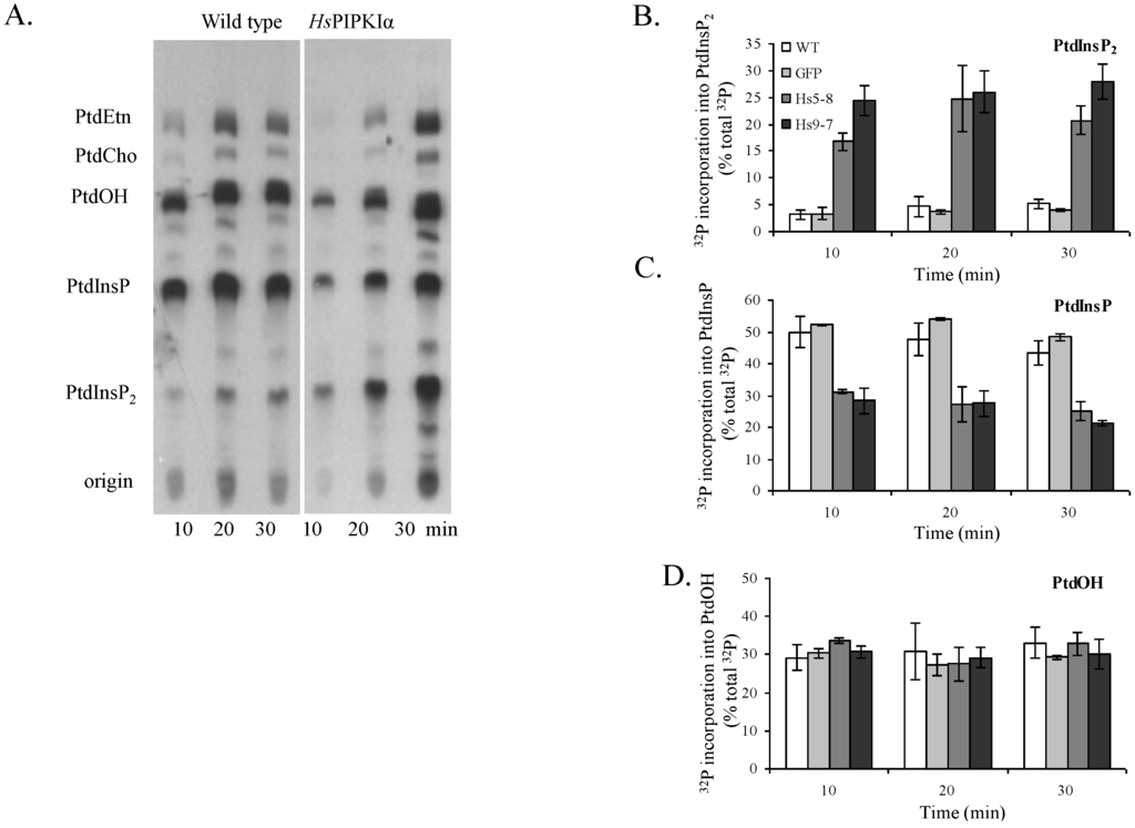 In vivo labeling studies with 32Pi indicate a rapid rate of [32P]PtdInsP2 biosynthesis in the HsPIPKIα lines. 13 or 17-d-old seedlings were pre-equilibrated in MS medium overnight; 32Pi (50 μCi per sample) was added, the seedlings were harvested, and lipids were extracted at the time points indicated. The lipids were separated by TLC, and 32P-labeled lipids were quantified with a Bioscan imaging scanner. (A) Representative autoradiogram of the TLC plate; (B, C, and D) show 32P recovered phospholipids (PtdInsP2, PtdInsP, and PtdOH, respectively) over the time course. The data are reported as percentage of total cpm recovered per lane. Each point is the average ± SD of duplicates from two or three independent experiments except for GFP which is the average ± SD of duplicates from one experiment.