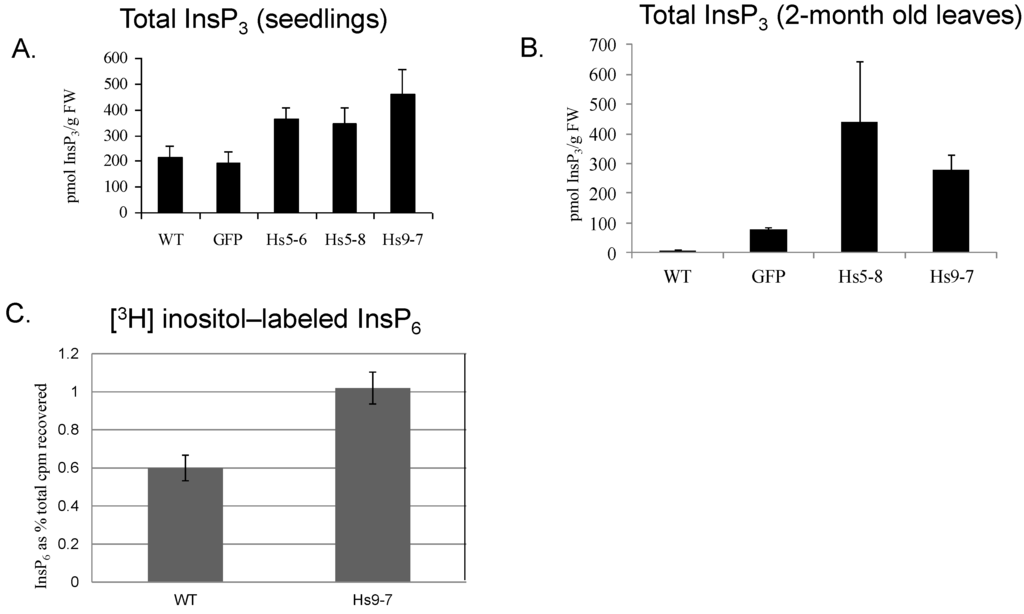 To determine how increased PtdIns(4,5)P2 levels would affect the total cellular Ins(1,4,5)P3 levels, we measured the total Ins(1,4,5)P3 in the soluble fraction of WT and HsPIPKIα plants using an Ins(1,4,5)P3 assay kit (Figure 6A). The basal Ins(1,4,5)P3 levels were increased 2 to 4-fold in the seedlings and in leaves of 2-month-old plants of HsPIPKIα compared to WT and GFP plants (Figure 6B). These data combined with the radioisotope labeling data indicate that the HsPIPKIα plants had increased flux in the PI pathway and were producing more InsP3.