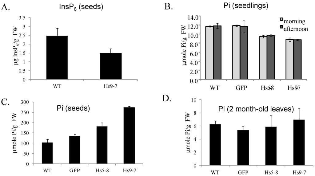 Total InsP6 decreased (A) and HOAc-soluble Pi (B) increased in HsPIPKIα seeds. The InsP6 data are the means ± SD of triplicate biological samples. The Pi data are the means of duplicate samples ± SD from 2 independent experiments. In seedlings, the HOAc-soluble Pi decreased by about 20% in the HsPIPKIα lines compared to wild type (C) There was no significant difference in HOAc-soluble Pi from 2 month-old leaves; (D) The data in (C) are the mean ± SD of 3 biological replicates harvested before the lights come on (morning) or before dark (afternoon). The data in (D) are the mean of duplicate samples ± SD from 2 independent experiments.