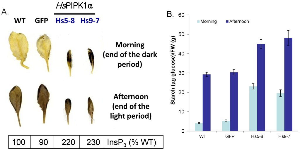Previously, we showed that increasing the flux through the PI pathway in tobacco cells grown in suspension culture resulted in increased sucrose uptake, increased respiration and with time, increased starch granules [49,59]. To visualize starch in HsPIPKIα plants, leaves from 6 week-old plants were stained with iodine (Figure 8A). Leaves from all the lines had less starch in the morning (morning is defined as plants harvested in the dark at 9 AM, 1 h before the lights came on) than afternoon (plants harvested at 5 PM, 1 h before the lights went off); however, leaves from HsPIPKIα plants showed significantly more starch than wild type. The increased starch was evident in leaves harvested both in the morning and afternoon. To quantify the differences, starch was analyzed from leaves of 3-week-old seedlings. In the HsPIPKIα leaves the starch was 5-fold higher in the morning samples and 1.5-fold higher in the afternoon samples compared to WT and GFP (Figure 8B). Since excessive starch accumulation can result in changes in chloroplast morphology, chloroplast structure was compared using EM. The chloroplasts of the HsPIPKIα plants appeared normal although swollen because of the large starch granules (Supplementary Figure 1) and total chlorophyll was not different in any of the lines (Supplementary Figure 2).