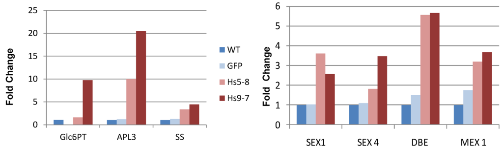 To further investigate how starch metabolism is altered in HsPIPKIα plants at the molecular level we monitored transcripts levels of genes that are involved in starch synthesis [60,61]. The ADP-glucose pyrophosphorylase 3 (APL3), which converts G1P and ATP to ADP-glucose and starch synthase (SS), responsible for elongating starch polymers, were up-regulated in both lines of the HsPIPKIα plants compared to WT and GFP (Figure 9A). The glucose-6-phosphate transporter (Glc6PT), which imports Glc6P from the cytosol into the chloroplast where it is converted to glucose-1-phosphate, was up-regulated in the Hs9-7 line but was only marginally increased (1.6 fold) in the Hs5-8 line. We also monitored transcript levels of genes that are involved in starch degradation such as glucan water dikinase (SEX1), phosphoglucan phosphatase (SEX4), α-amylase (DBE) and maltose transporter (MEX). They were all highly expressed in HsPIPKIα plants compared to WT and GFP plants (Figure 9B). Although starch degradation genes were higher in the kinase plants, the relative loss of starch during the night was only 50%–60% in the HsPIPKIα plants whereas 85%–87% of the starch was lost in the WT and GFP plants. These data suggest that the HsPIPKIα plants were not mobilizing all the starch during the night to sustain cellular metabolism. Light/dark regulation of starch metabolism is complex. While starch metabolism appears to be under circadian control [62], plants are able to respond to environmental cues and adjust starch metabolism to compensate for day length [63]. Our data suggest that expression of HsPIPKIα affected the light/dark sensing that regulates starch metabolism.