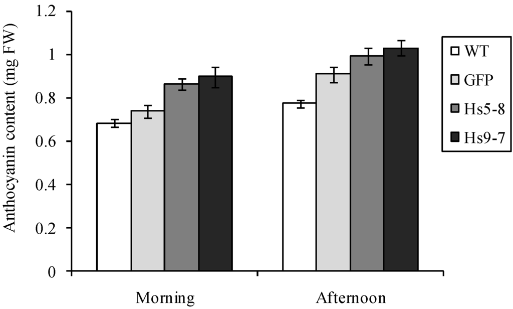 Increased anthocyanin biosynthesis is an indication of stress and a change in carbon flux. When anthocyanin levels were compared, the HsPIPK1α plants had more anthocyanin whether they were harvested morning or afternoon (Figure 10).