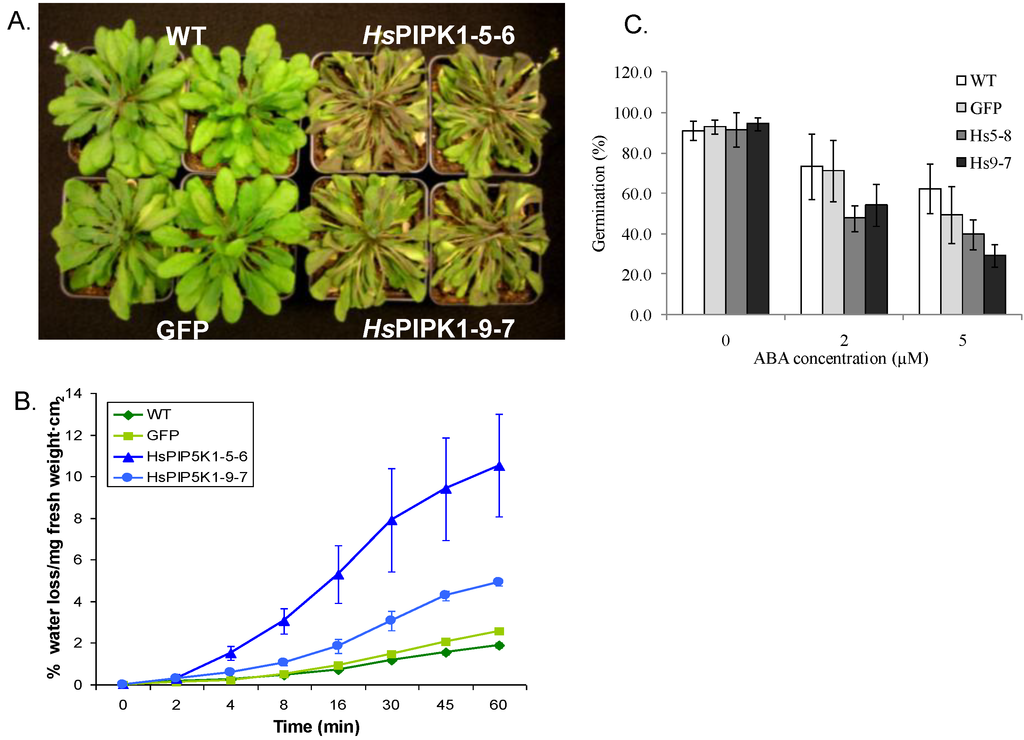 The HsPIPKIα plants are drought sensitive and have increased water loss in the detached leaf assay. Plants were grown under a short day cycle (8 h of light/16 h of dark) at 21 °C with a light intensity of 150 µmol·m−2·s−1 in the North Carolina State University Phytotron in a growth chamber. (A) Water was withheld for 9 days and plants were photographed; (B) Detached leaves from well-watered plants were used to measure water loss over time; (C) The seeds from the HsPIPKIα lines are more sensitive to ABA. The data are evaluated 3 days after seed germination on media containing different concentration of ABA. ~100 seeds per each concentration were tested in 3 independent experiments (Mean ± SE).