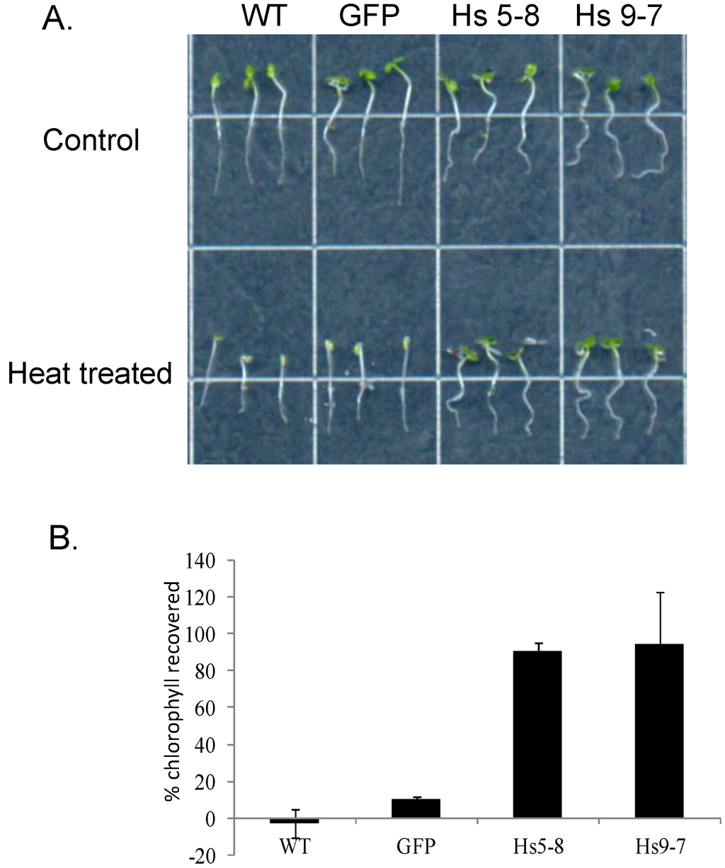 HsPIPKIα seedlings are more tolerant of heat and light. (A) Seedlings were grown in the dark for 2.5 days, exposed to 48 °C for 30 min and placed in the light 24 h or kept in the light at room temperature (control); (B) Chlorophyll was extracted in acetone and absorbance was measured at 663 nm. The data are reported as % of the control chlorophyll recovered per g FW. The data are the means ± SD for 3 biological replicates consisting of 25 seedlings.