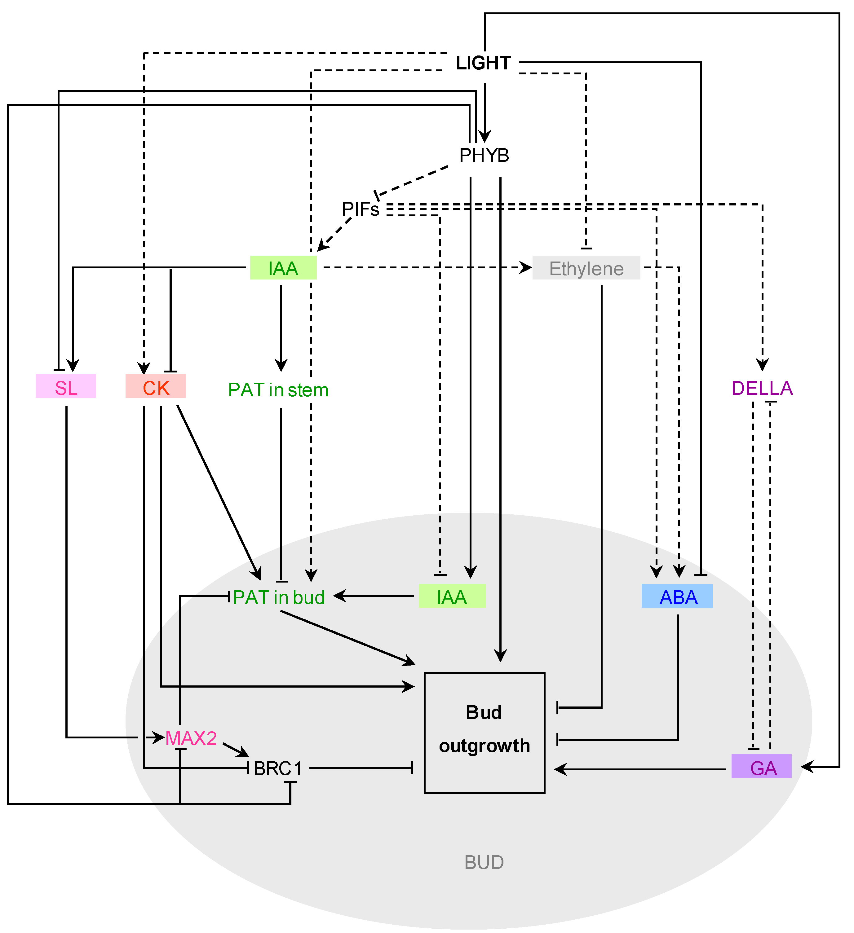 Phytochrome B (PHYB) is a major light integrator that positively regulates bud outgrowth [55]. PHYB is known to repress Phytochrome Interacting Factors (PIF) during photomorphogenesis [170]. The role of PIFs in bud outgrowth is not established yet. During seedling development, PIFs interact with auxin (IAA) synthesis and signalling [86,171] and both stimulation and inhibition of IAA synthesis by PIFs were reported [171,172]. The up-regulation of auxin synthesis genes in the bud by PHYB [55] would promote the establishment of the polarized auxin transport (PAT) between bud and stem, a prerequisite for bud outgrowth. At the shoot apex, down-regulation of auxin synthesis through PIFs regulation would rather decrease apical dominance, as apex-derived auxin inhibits cytokinin (CK) synthesis [105], promotes strigolactone (SL) synthesis [126,127] and increases PAT in the stem. PIFs could also act in the control of bud outgrowth through the control over other hormonal pathways. In seedlings, PIFs inhibit gibberellin (GA) synthesis by regulating DELLA proteins and induce abscisic acid (ABA) synthesis [154,155], two processes thought to repress bud outgrowth. Light however was shown to induce GA synthesis [151] and inhibits ABA and ethylene synthesis [164,168]. As both ABA and ethylene are bud outgrowth inhibitors, the effect of light on these two growth regulators would promote bud outgrowth. Auxin-induced ethylene production could also induce ABA synthesis [173,174] leading to bud outgrowth inhibition; such an induction could be mediated by PIF proteins [164,175]. Light, via PHYB, strongly affects the SL pathway by down-regulating SL synthesis, signaling (MAX2) and response (BRC1) genes [55,92]. MAX2 has a negative effect on the establishment of PAT in buds and positively controls the expression of BRC1. BRC1 expression is also repressed by CKs [55,96,176], a positive bud outgrowth regulator that also promotes PAT in buds [99,129]. Light could in turn promote bud outgrowth through its positive impact on CKs signalling in SAM as shown in excised tomato apices [118].
