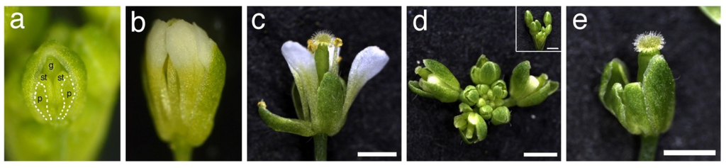 (a) fop2-1 flower whose sepal is removed at stage 11. Petals are indicated by white dotted line. p, petal; st, stamen; g, gynoecium; (b) Same flower as (a) after three days. Note the straight elongation of petals; (c) prs-1 fop2-1 flower; (d) Inflorescence of prs-1 fop2-1. Inset is inflorescence of fop2-1; (e) ap3-5 fop2-1 flower. Bars: 1 mm.