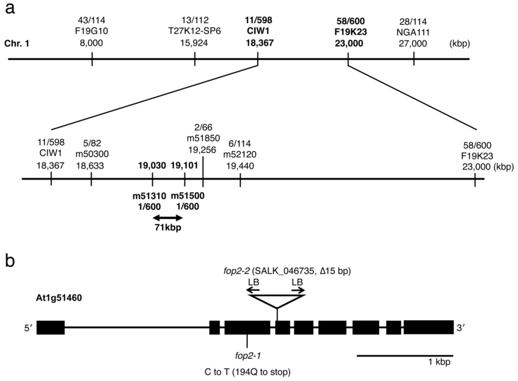 (a) Diagram of FOP2 mapping. DNA markers and number of recombinants are indicated; (b) Genomic structure of the FOP2 gene. Point mutation of fop2-1 and T-DNA insertion, which causes the 15 bp deletion, in fop2-2/SALK_046735 are indicated. LB, left border of T-DNA. See Figure S2 for FOP2 genomic sequence.