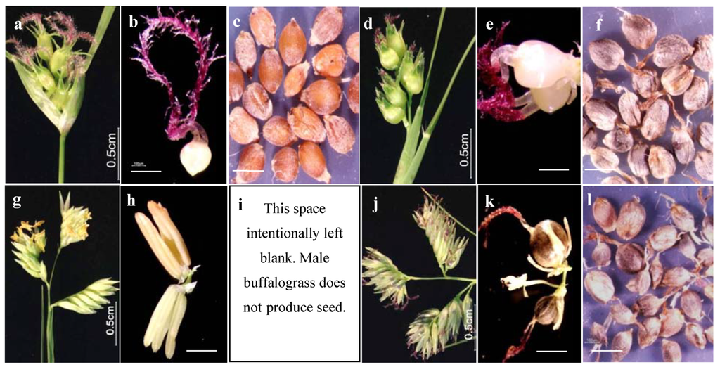 - Wenger, L.E. Inflorescence variations in buffalo grass, Buchloe dactyloides. J. Am. Soc. Agron. 1940, 32, 274–277. [Google Scholar] [CrossRef]