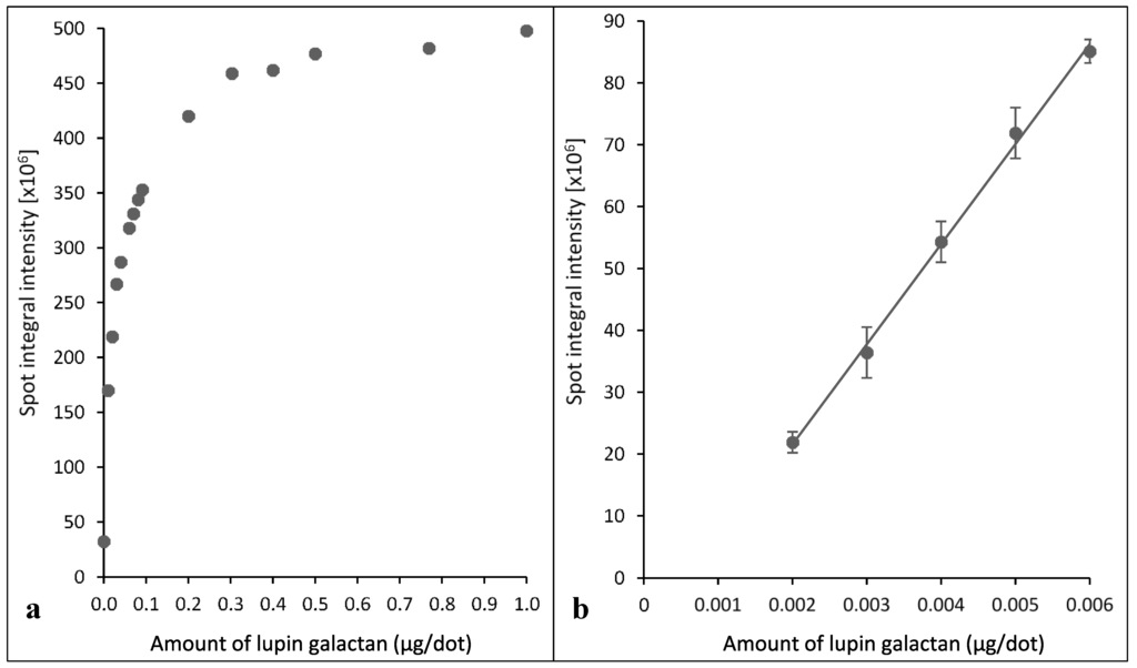(a) Curvilinear relationship of spot integral intensity to amount of lupin seed (1→4)-β-galactans in the dilution series generated with Xplore software; (b) linear relationship of spot integral intensity to amount of lupin seed (1→4)-β-galactans at lower dilutions showing a strong positive correlation of amounts of (1→4)-β-galactans to the spot integral intensity (R2 = 0.99; y = (2(1010)x−1(107)); (R2 = Coefficient of determination; y = spot integral intensity; x = amount of galactan (µg/dot)). Error bars indicate the standard errors.