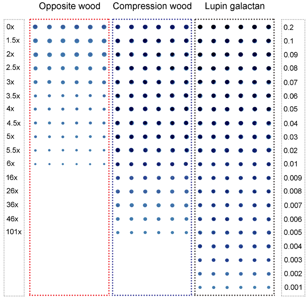 The dried nitrocellulose membranes were scanned to produce TIFF images (1200 dpi) using a desktop scanner (Model DCP-130C; Brother International, Bridgewater, NJ, USA) that were then converted into inverted 16-bit grey-scale images using Adobe Photoshop (Creative Suite 6; Adobe Systems, San Jose, CA, USA). Xplore image processing software (LabNEXT Inc, West New York, NJ, USA), which includes grids, was then used to generate spot integral intensities (heat map values) of the spots, which were exported as comma separated values (csv) and opened in Excel format. The spot integral intensity is a specific numerical value generated by the Xplore program and is based on the numbers of spots per unit area defined by a grid. Mean values for each set of six replicate spot integral intensities were computed. The final spot integral intensities were calculated by subtracting the values of blank (no sample) spots. These were converted into mg of (1→4)-β-galactans extracted per 100 mg of dry wood (i.e., weight percentages) by comparing the intensities with those given by the lower range (0–0.006 µg/dot) (Figure 1) of a dilution series of lupin seed (1→4)-β-galactans. In the final calculation, it was assumed that the lupin seed (1→4)-β-galactans preparation contained 91% (1→4)-β-galactan as indicated in the Megazyme literature.