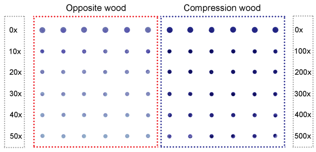 Immuno-dot assays of (1→4)-β-galactans in extracts of delignified wood of Tree 7. Extracts of opposite wood (five dilutions 0× to 50×) and compression wood (five dilutions 0× to 500×; each dilution has six replicates. This shows a scanned image (1200 dpi) of the nitrocellulose membrane with blue dots.