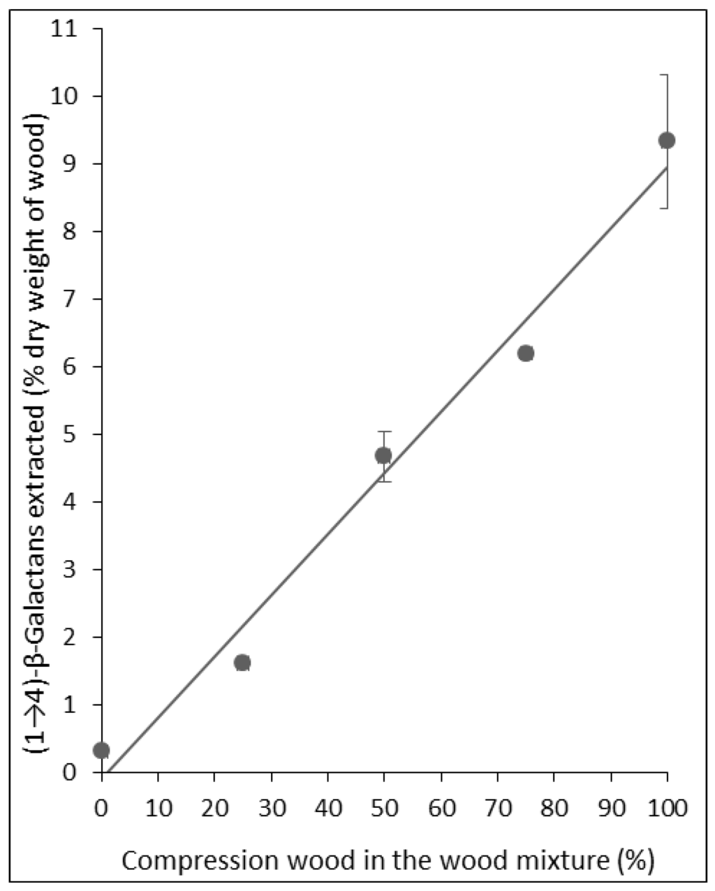 For the mixtures of compression wood and opposite wood, the relationship between percentage galactose and percentage of compression wood in the mixture was again linear [18].