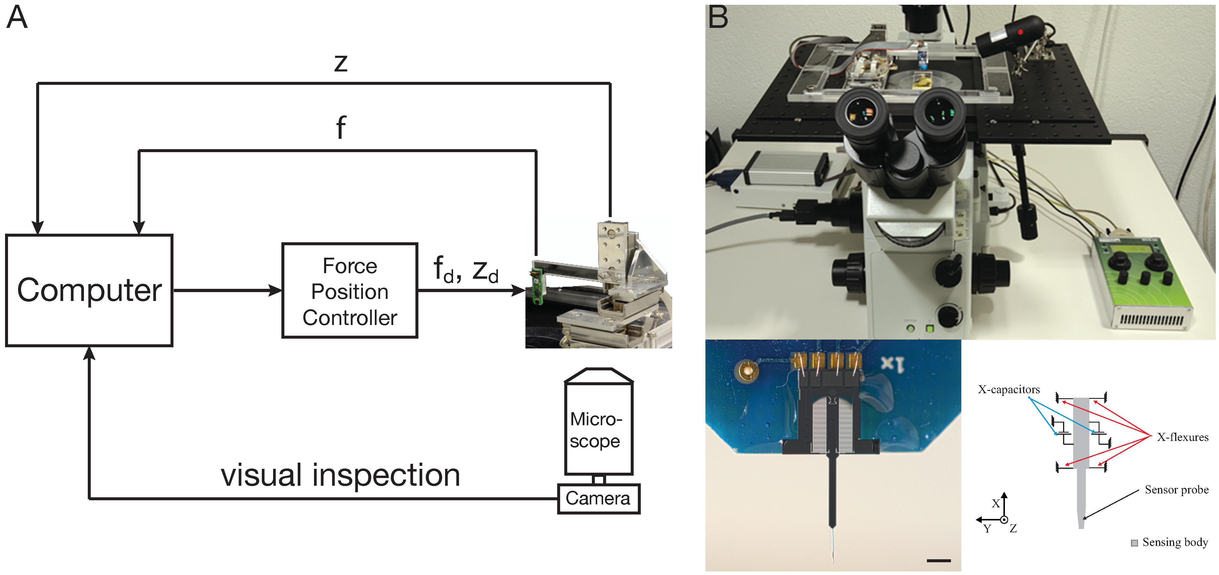 The cellular force microscope (CFM). (A) Schematic representation of the CFM. f and z are the measured values and fd, zd are the desired values of force and position, respectively. (B) The CFM setup on an inverted microscope. The lower panels show an image of the MEMS-based force sensor on the left and a schematic on the right side. Scale bar = 1 mm. Images in (B) taken from [68].