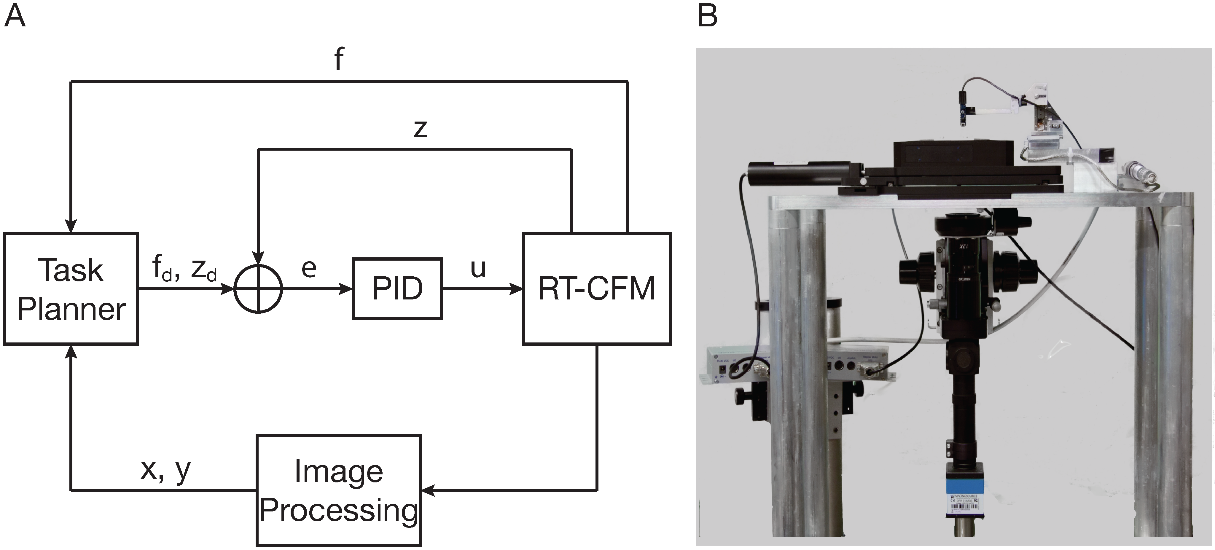 The real-time cellular force microscope (RT-CFM). (A) Schematic representation of the RT-CFM. f and z are the measured values, and fd, zd are the desired values of force and position, respectively. e is the error between the desired and the measured values of force and position, and u is the control signal that is fed into the RT-CFM positioner. x and y are the coordinates of the measurement location to which the system has to be positioned. The task planner switches the system between measurement, positioning, calibration and post-processing tasks. The proportional-integral-derivative (PID) is the control scheme used to control to the positioner. (B) Custom inverted RT-CFM setup. Block diagram in (A) adapted from [78].