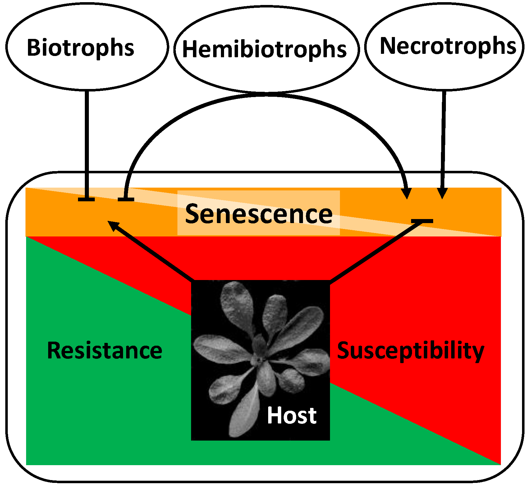 Relationship between senescence and resistance/susceptibility in necrotrophic and biotrophic host-pathogen interactions. Biotrophic pathogens and hemibiotrophs in their biotrophic stage inhibit senescence to increase susceptibility. The host can control pathogen growth and promote resistance by activating senescence-like processes. Necrotrophic pathogens and hemibiotrophs in their necrotrophic stage induce senescence to increase susceptibility. The host can control pathogen growth and promote resistance by inhibiting senescence-like processes. Hemibiotrophs switch from a biotrophic to a necrotrophic lifestyle in the course of their development. Arrows stand for activation/induction, bars for inhibition.