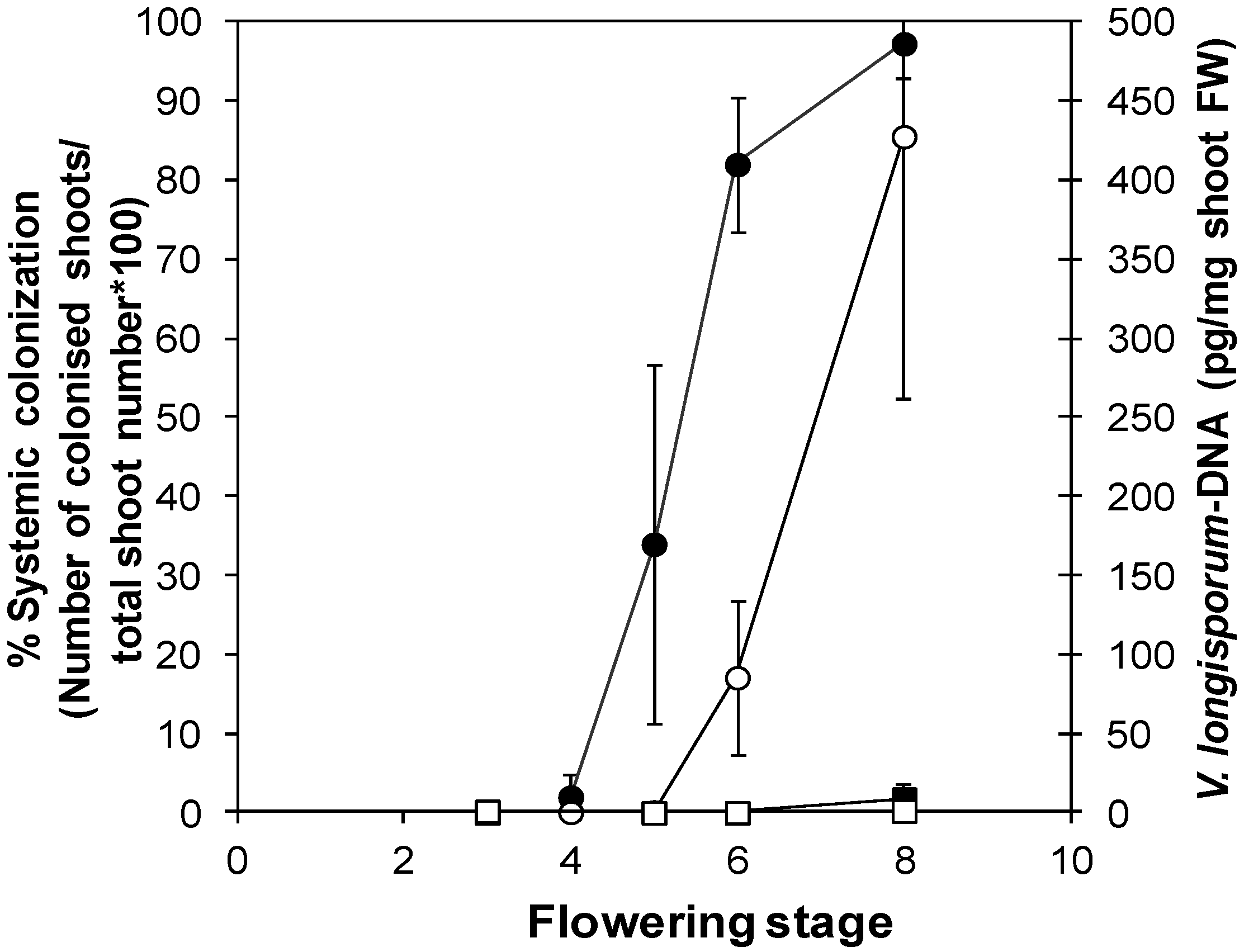 Systemic colonization of Ler and Bur by V. longisporum in the course of plant development. Percentage of colonized apical shoot segments in a plating assay (closed symbols) and fungal DNA-content determined by qPCR in apical shoot segments (open symbols) in Ler (circles) and Bur (squares) at different developmental stages. Developmental stages: 3 = 1–3 flowers open, 4 = 4–10 flowers open, 5 = more than 10 flowers open, 6 = up to 3 siliques mature, 7 = 4–6 siliques mature, 8 = up to 50% of siliques on main shoot mature. N = 4 (Bur) or 5 (Ler), one replicate corresponded to a batch of 30 plants. Error bars denote standard deviations (data from [188]).