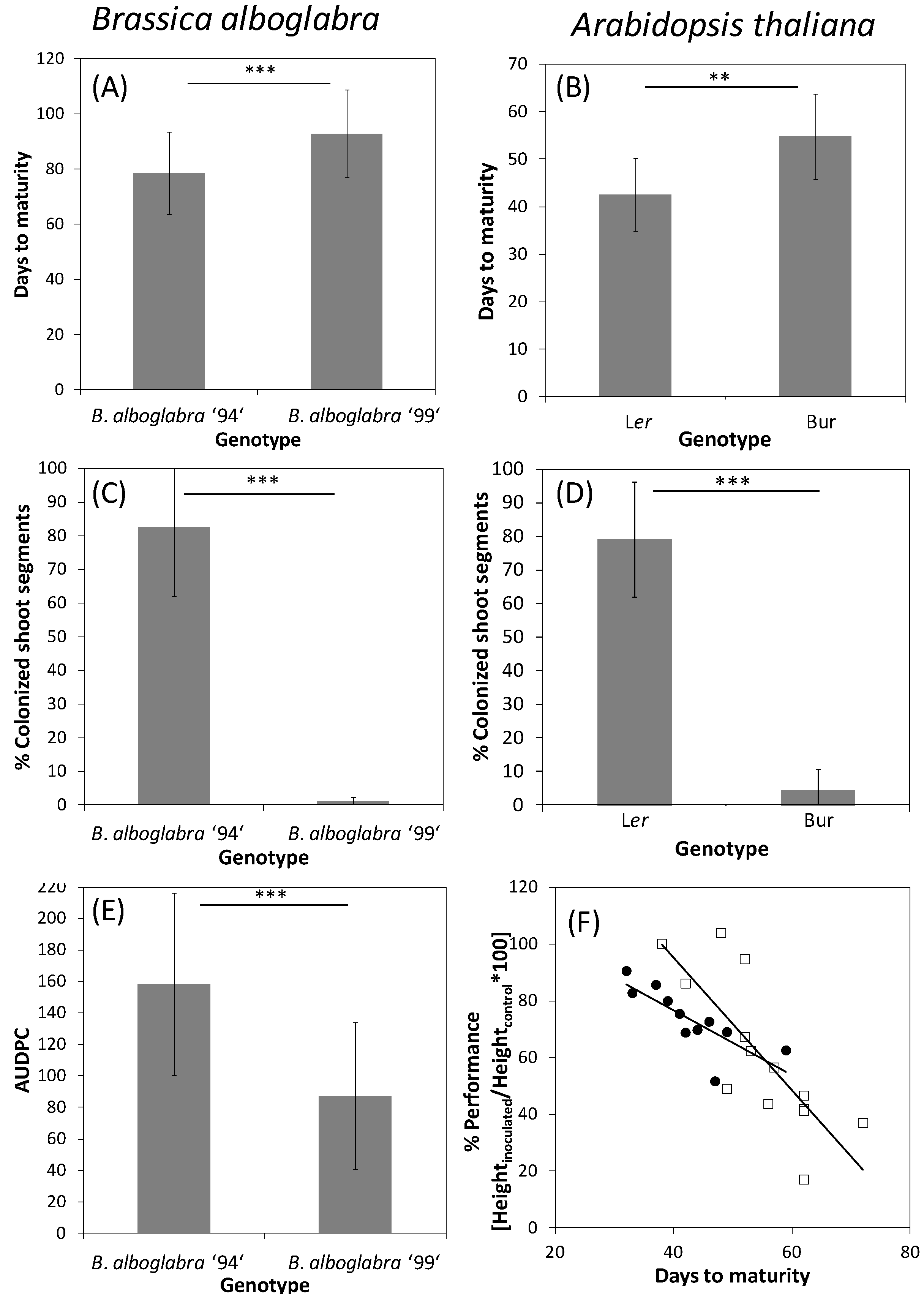 Developmental type and V. longisporum disease parameters of two accessions of B. alboglabra (left side) and A. thaliana (right side). (A,B) Development time of mock-inoculated control plants from inoculation to maturity (B. alboglabra) or germination to maturity (A. thaliana). (A) Single-plant data pooled from three independent experiments, N = 58 (94), N = 59 (99); (B) Average values from means of 9 and 11 independent experiments comprising at least 15 plants each; (C,D) Systemic colonization by V. longisporum. (C) N = 5; (D) N = 9 (Ler), N = 11 (Bur); (E) Area under the disease progress curve (AUDPC, [191]) of V. longisporum-inoculated plants. High values stand for fast disease progression. Single-plant values from six independent experiments, N = 243 (94), N = 253 (99); (F) Performance of Ler (circles) and Bur (squares) after V. longisporum infection depending on development time (data from [188]). Development was prolonged in winter experiments under lower light intensities. Performance (%) = Heightinoculated/Heightcontrol *100. Each data point represents a separate experiment comprising at least 30 plants. Experiments were performed at different seasons over three years under greenhouse conditions. Correlations: Ler: r = −0.79, p = 0.004; Bur: r = −0.79, p < 0.001. Error bars denote standard deviations, asterisks denote significant differences below the 0.01 (**) and 0.001 (***) significance levels respectively (Student’s t-test).