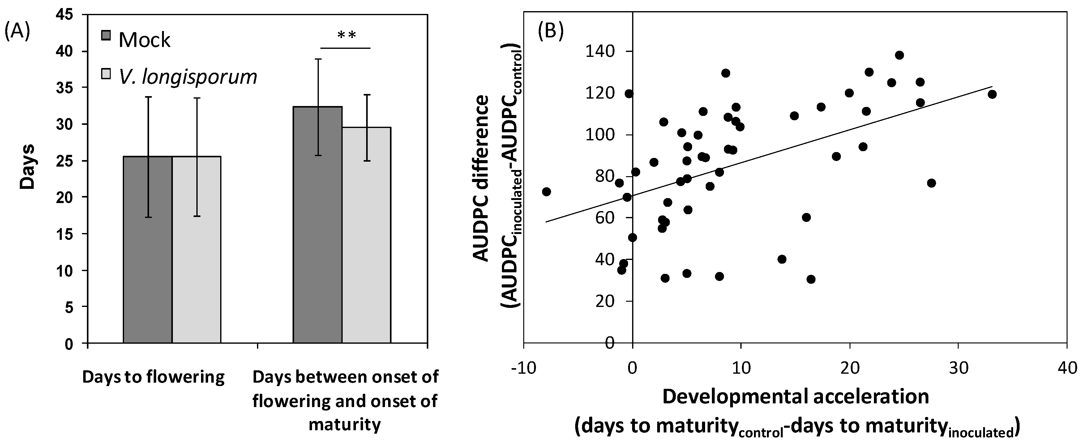 Developmental acceleration in A. thaliana and B. alboglabra after V. longisporum infection. (A) Flowering time and maturation time in a collection of 100 A. thaliana (Bur × Ler)-recombinant inbred lines (RILs) after mock- and V. longisporum inoculation respectively. N = 94 to 102, each replicate corresponded to a batch of at least 15 plants. Asterisks denote a significant difference of p < 0.01 (t-test), error bars denote standard deviations. (B) Correlation between developmental acceleration by V. longisporum and disease progression, expressed as AUDPC difference between inoculated and mock-inoculated plants in B. alboglabra (94 × 99)-F3-families. N = 52, r = 0.49, p < 0.01. Each data point represents one F3-family, differences were calculated from means of 38 inoculated and 11 mock-inoculated plants in each F3-family.