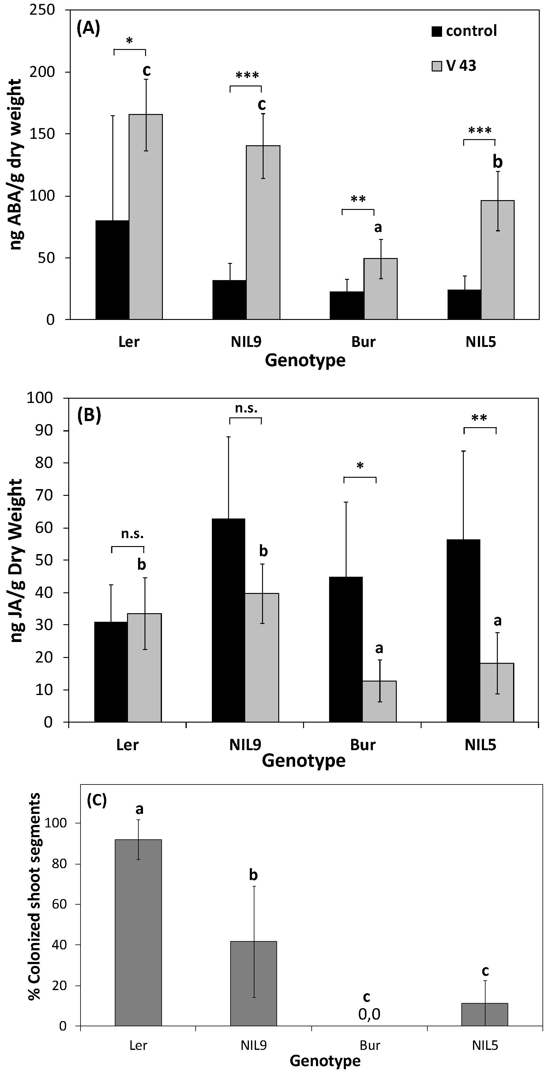 Hormone contents and systemic colonization by V. longisporum in A. thaliana ecotypes Ler, Bur, and near-isogenic lines differing in a region containing the colonization resistance QTL vec1 on chromosome 2. Contents of (A) abscisic acid (ABA) and (B) jasmonic acid (JA) in Bur, Ler and two (Bur × Ler)-near-isogenic lines (NILs): NIL9 (Ler alleles in the variable region) and NIL5 (Bur alleles). Asterisks refer to the significance level of differences between mock-inoculated and V. longisporum-treated plants within one genotype (t-test). Mean contents of inoculated plants marked with different letters differed significantly at p < 0.05. Mean phytohormone contents of controls did not differ significantly (one-way ANOVA and post-hoc Tukey test). N = 6–7, each replicate corresponded to a batch of 15 plants. Vertical bars denote standard deviations (data from [79]). (C) Systemic colonization by V. longisporum in the same plants that have been used for phytohormone measurements. Means marked with different letters differed at p < 0.05 (one-way ANOVA and post-hoc Tukey test). N = 6–7, each replicate corresponded to a batch of 15 plants. Vertical bars denote standard deviations.