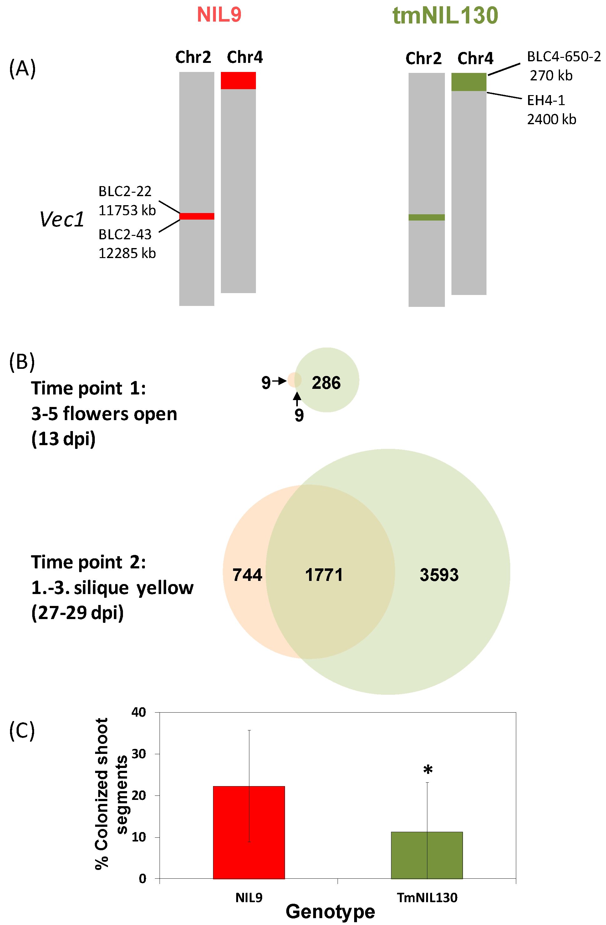 Differential gene expression and systemic colonization after V. longisporum infection in two (Bur × Ler)-NILs differing in a region within the colonization resistance QTL vec1. (A) Genotype of NIL9 and tmNIL130 in the variable regions. Red parts stand for Ler alleles, green parts for Bur alleles in the variable regions. Grey parts are isogenic with respect to the tested marker loci (for marker grid in isogenic regions see [79]). Names and physical positions in kilobases (kb) of markers delimiting variable regions are given next to the bars representing chromosomes. For primer information see Supplementary File Table S1; (B) Genes differentially expressed by V. longisporum infection in the hypocotyl-shoot-transition zone of NIL9 and tmNIL130 at two time points after infection. For growth-, inoculation- and RNA extraction protocol see GEO accession GSE70021. Hybridization to Affymetrix AraGene-1_1-st was performed by the Nottingham Arabidopsis Stock Centre (NASC) Affymetrix service [212]. Data were rma- (robust multichip average) normalized using the Bioconductor package affy [213], and differential expression was calculated using linear models with the Bioconductor package limma [214] by pairwise comparisons. Annotations were provided by the Bioconductor pd.aragene.1.1.st annotation package [215]. Only expression differences with a significance level of p < 0.05 were regarded at the probeset level. If more than one probeset represented a transcript cluster (≙ mRNA), transcript cluster means were calculated from values for individual probesets; (C) Systemic colonization of NIL9 and tmNIL130 at time point 2 (onset of silique maturity). N = 12, t-test. Samples were taken from 30 plants per replicate, among which were also the plants sampled for microarray analysis.