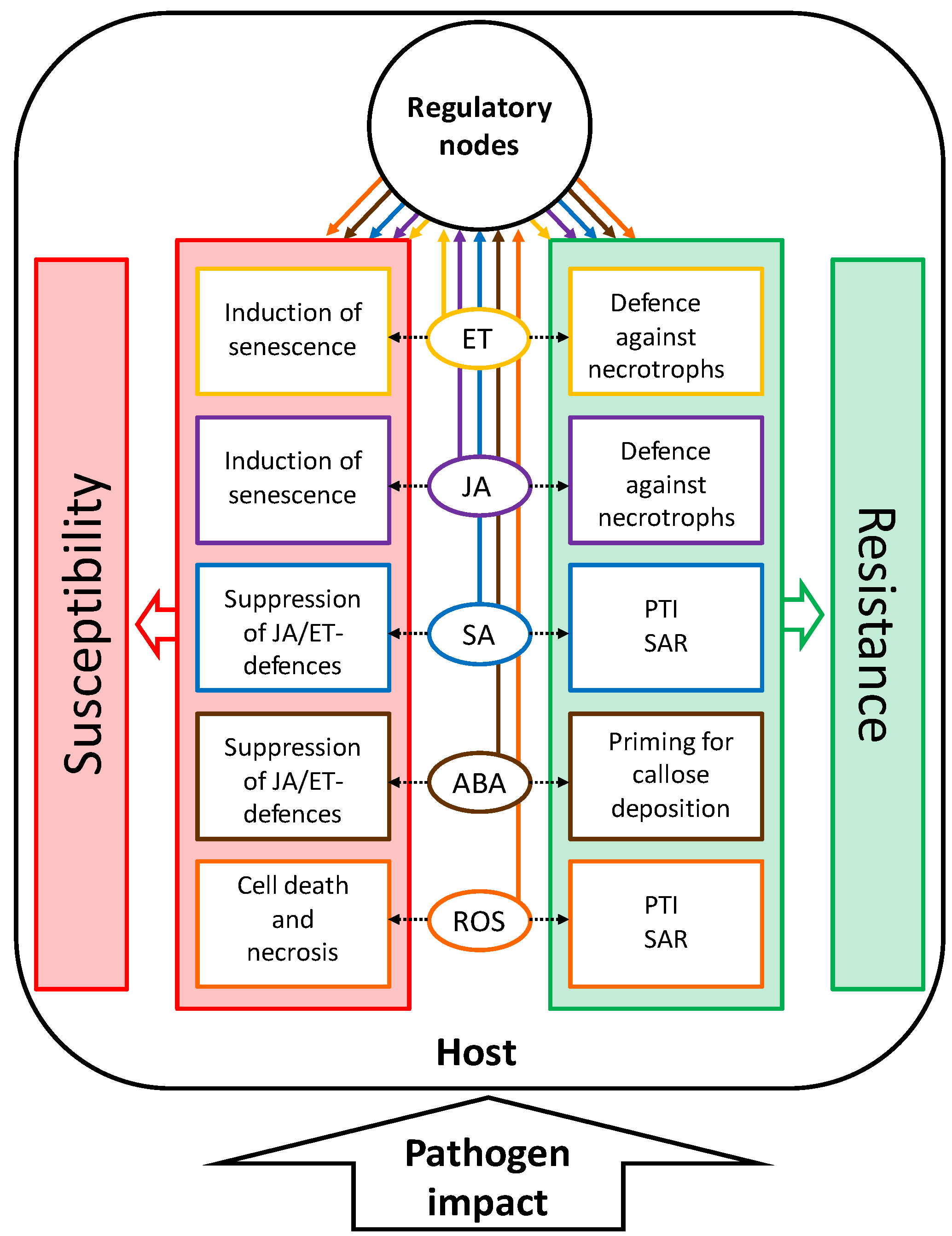 ABA has perhaps the most multi-faceted role in senescence regulation and in the control of defense against pathogens. Whereas ABA is generally regarded as a senescence-promoting hormone, its role in pathogen defense is ambiguous for biotrophic as well as necrotrophic pathogens [54]. Crosstalk with many other signaling pathways and cellular processes such as JA-, ET-, SA-, cytokinin- and sugar signaling, ROS production and signaling as well as autophagy exists [47,55,56,57,58].