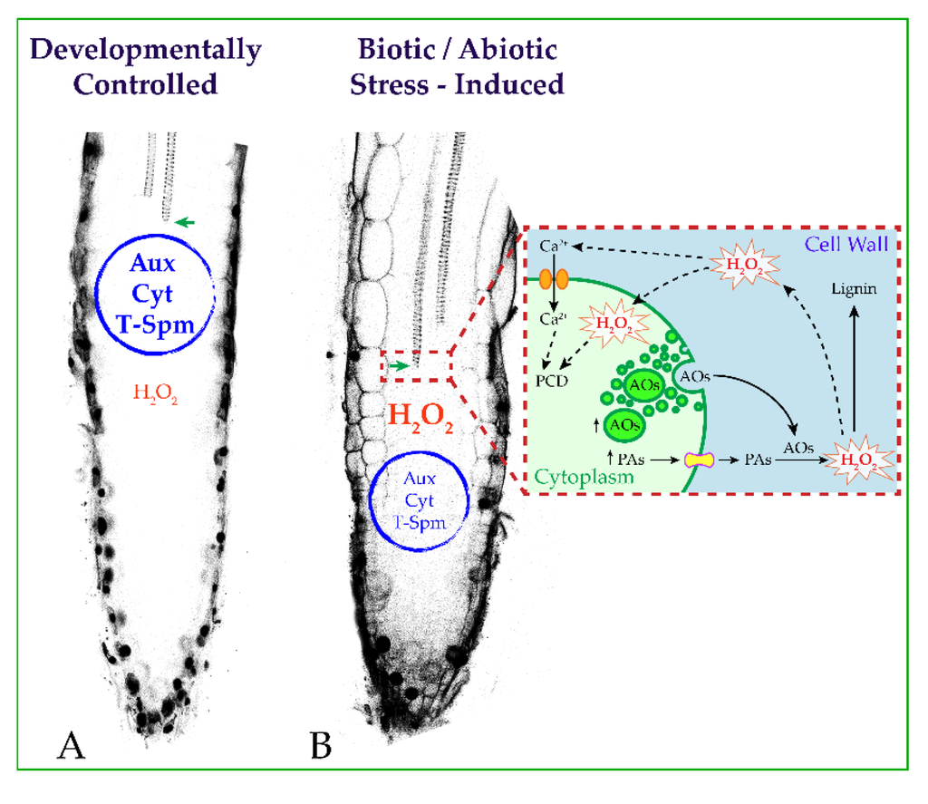 Ectopic overexpression of ZmPAO in the cell wall of tobacco plants drives early xylem differentiation associated with enhanced H2O2 production in root apex and induces PCD in root cap cells []. In these plants, oxidation of developmentally-secreted PAs may be accelerated by the overexpressed ZmPAO, simulating the high level of PA oxidation occurring in stressed plants and, thus, leading to an altered phenotype [].