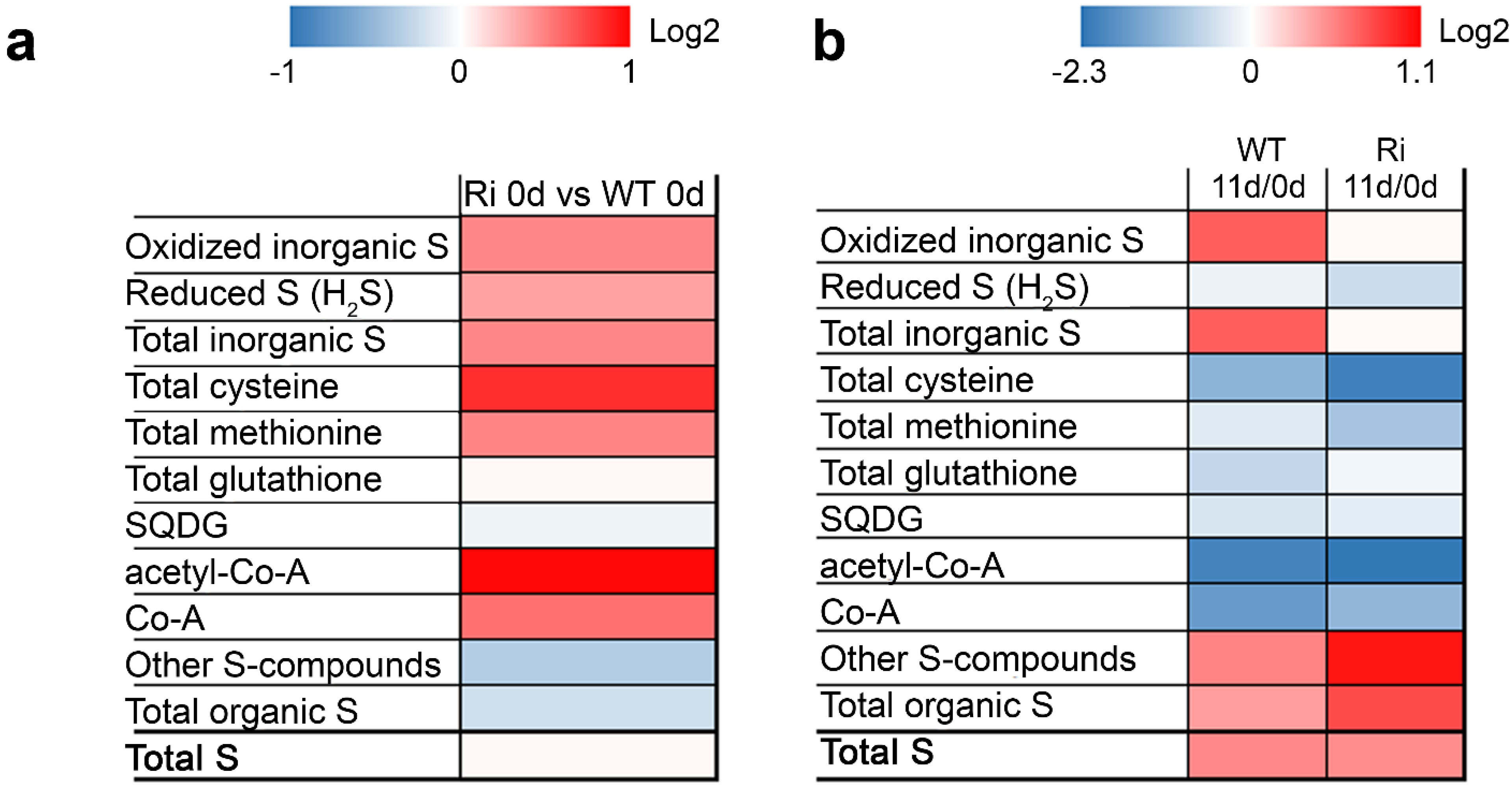Turnover of sulfur containing metabolites in wild-type (Wt) and sulfite oxidase (SO) RNA interference mutants (Ri) plants grown under normal growth conditions (0 day) and after being exposed to an extended dark stress for eleven days (11 day). The Log2 of sulfur containing metabolites are given by shades of red or blue colors according to scale bar. (a) Relative difference of sulfur-containing metabolites in SO Ri mutants calculated as ratio to WT 0 day; (b) The relative difference of S-containing metabolites was calculated as the ratio of metabolite content in plants after the dark stress (11 day) to the content detected in the unstressed plants (0 day). The other S-compounds metabolites were calculated as the difference between total content of sulfur to the known S-containing metabolites. The organic S was calculated as the difference between total S to the inorganic S (oxidized + reduced). The level of significance was estimated with Turkey-Kramer HSD test (JMP 8.0 software, [37]; p < 0.05. n = 3–10) and is presented in Supplementary Table S2. The data for SO-compromised plants represent the mean for SO Ri 131 and SO Ri 421 mutants.