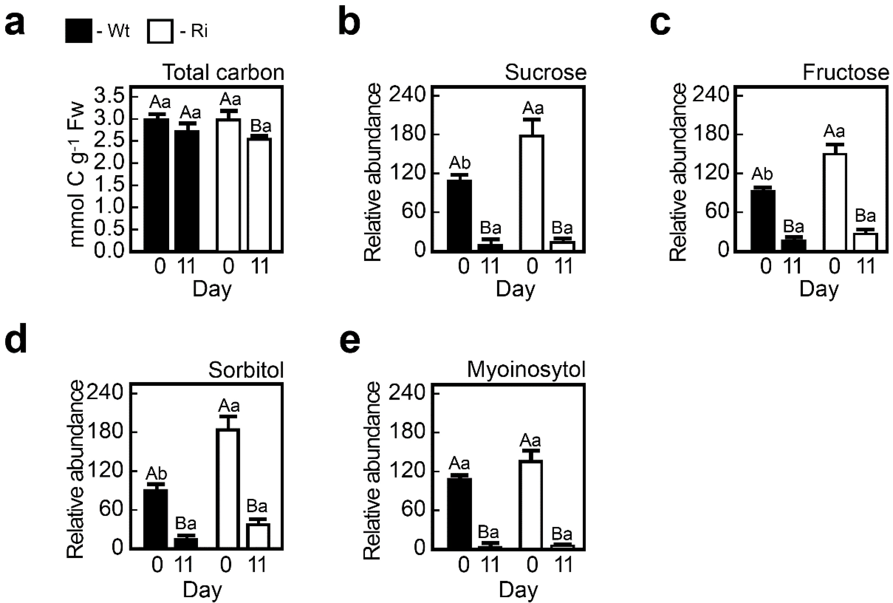 Energy-source metabolites in wild-type (Wt) and SO RNA interference mutants (Ri) plants grown under normal growth conditions (0 day) and after being exposed to eleven days of dark stress (11 day). Top leaves of WT and Ri tomato plants were used to determine total carbon levels (a). Relative carbohydrate, sugars sucrose (b); fructose (c); sugar alcohols; sorbitol (d) and myoinositol (e) contents were also determined. The bars represent the average values ± SE (n = 3–8). Values denoted with different letters are significantly different according to the Turkey-Kramer HSD test (JMP 8.0 software, [37]; p < 0.05). Different lower case letters indicate differences between the SO mutants and wild-type plants under the same treatment. Different upper case letters indicate significant differences within the plant genotypes in response to treatment. The data for the SO-compromised plants represent the mean for SO Ri 131 and SO Ri 421 mutants.