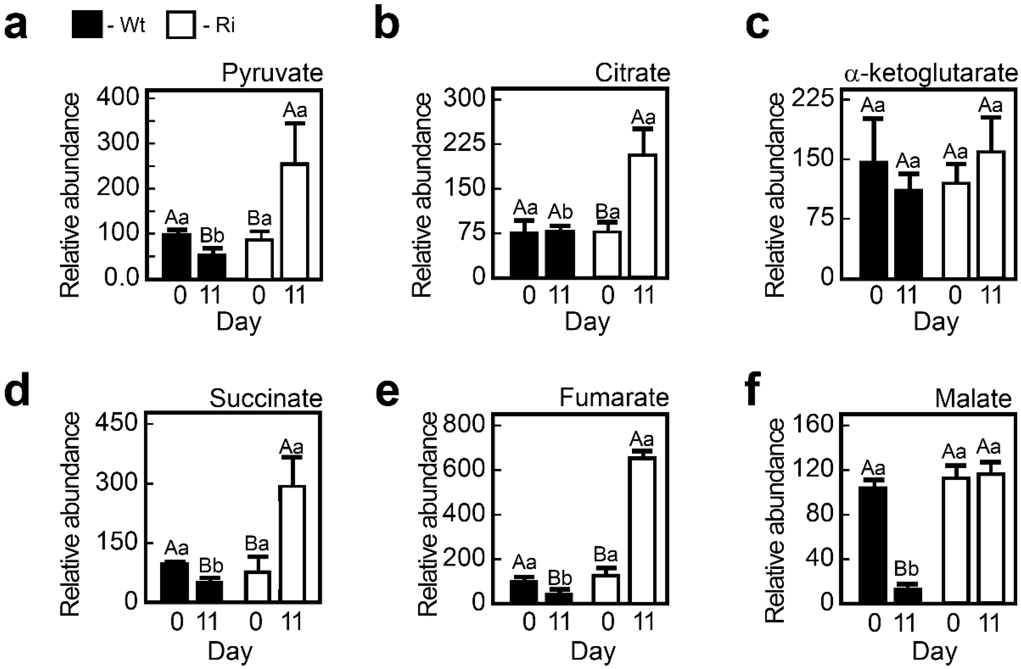 The levels of pyruvate, the product of glycolysis, and tricarboxylic acid cycle (TCA) cycle intermediates in wild-type (Wt) and SO RNA interference mutants (Ri) plants grown under normal growth conditions (0, day) and after being exposed to eleven days of extended dark stress (11, day). Top leaves of Wt and Ri tomato plants were used to determine pyruvate (a); citrate (b); a-ketoglutarate (c); succinate (d); fumarate (e) and malate (f) content. The bars are the average values ± SE (n = 3–8). The values denoted with different letters are significantly different according to the Turkey-Kramer HSD test (JMP 8.0 software, [37]; p < 0.05). Different lower case letters indicate differences between the SO mutants and wild-type plants within the same treatment. Different upper case letters indicate significant difference within the plant genotypes in response to treatment. The data for SO-compromised plants represent the mean for SO Ri 131 and SO Ri 421 mutants.
