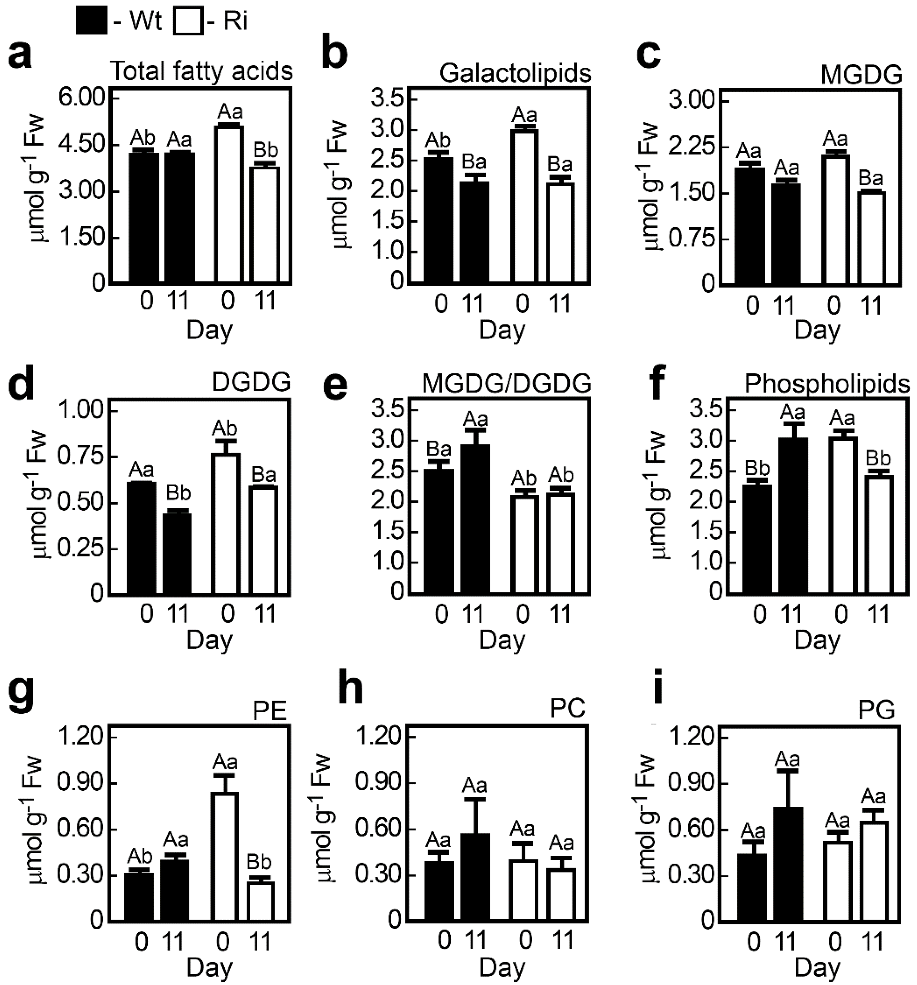 Lipid content in tomato wild-type (Wt) and SO RNA interference mutant (Ri) plants grown under normal growth conditions (0, day) and after being exposed to eleven days extended dark stress (11, day). Total polar lipids (a), total galactolipids (b) and individual galactolipids, (c,d) as well as the ratio between the galactolipids (e), total phospholipids (f) and individual phospholipids (g–i) were quantified by Trace GC Ultra as their methyl esters of the constituent fatty acids after two-dimensional thin-layer chromatography. First dimension was chlorophorm:Methanol:H2O (65:25:4, v/v/v) followed byChlorophorm:Methanol:NH4OH: Isopropylamine (65:35:5:0.5, v/v/v/v) and visualization under UV. Abbreviations are: digalactosyl-diacylglycerol (DGDG); monogalactosyl-diacylglycerol (MGDG); phosphatidylglycerol (PG); phosphatidylcholine (PC); phosphatidylethanolamine (PE). The bars are the average values ± SE (n = 3). The values denoted with different letters are significantly different according to the Turkey-Kramer HSD test (JMP 8.0 software, [37]; p < 0.05). Different lower case letters indicate differences between SO mutant and wild-type plants within the same treatment. Different upper case letters indicate significant difference within the plant genotypes in response to treatment. The data for SO-compromised plants represent the mean for SO Ri 131 and SO Ri 421 mutants.