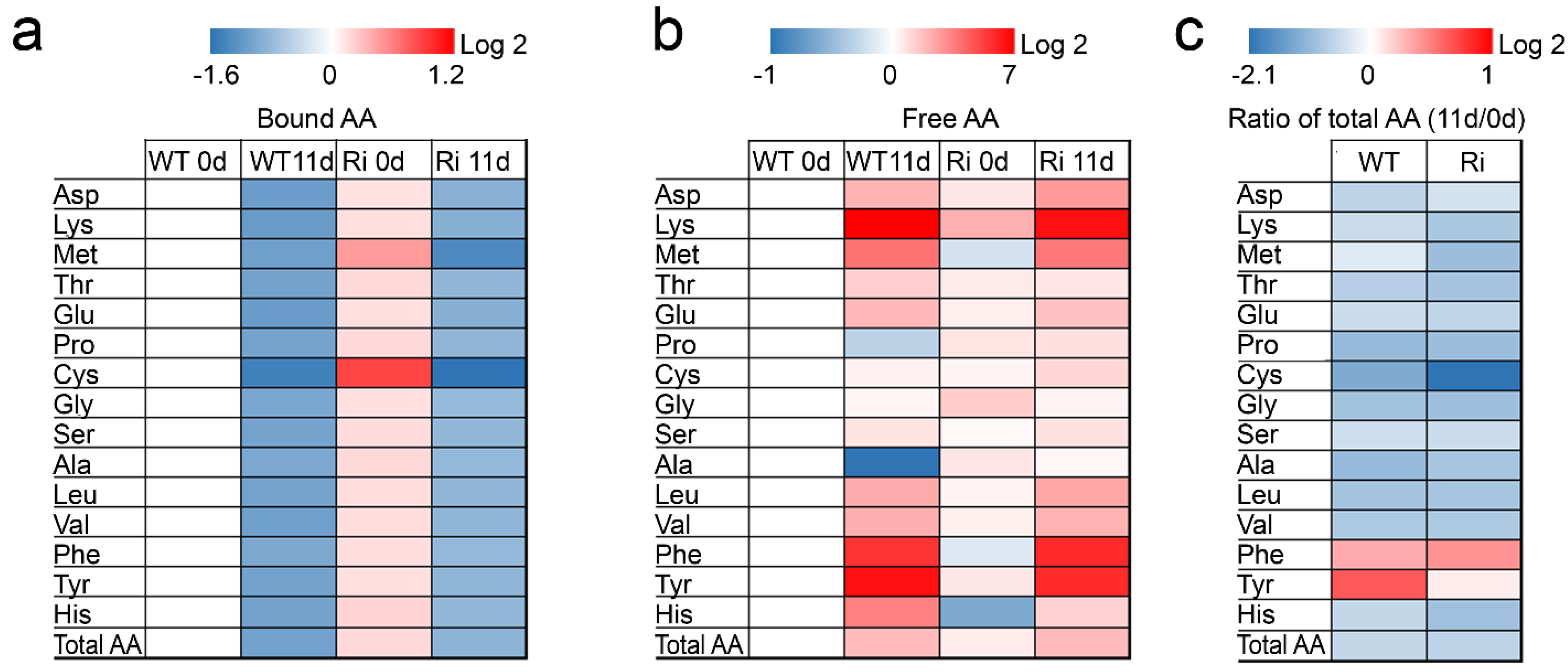Heat map of free and protein bound amino acids in wild-type (WT) and SO RNA interference mutant (Ri) plants grown under normal growth conditions (0, day) and after being exposed to eleven days of extended dark stress (11, day). Log2 ratios of bound (a) and free (b) amino acids (AA) fold-changes from WT 0 day are given by shades of red or blue colors according to the scale bar; (c) Log2 ratios of residual to initial total AA were calculated as the Log2 ratio of total AA at 11 day to 0 day and are given by shades of red or blue colors according to scale bar. Asp—aspartate; Lys—lysine; Met—methionine; Thr—threonine; Glu—glutamate; Pro—proline; Cys—cysteine; Gly—glycine; Ser—serine; Ala—alanine; Leu—leucine; Val—valine; Phe—phenylalanine; Tyr—tyrosine; His—histidine. Data represent the mean value of three (WT) and six (Ri) biological replicates for each tissue and time point and statistical analysis performed using Turkey-Kramer HSD test (JMP 8.0 software, [37]; p < 0.05), presented in Supplementary Table S3. The data for SO-compromised plants represent the mean for SO Ri 131 and SO Ri 421 mutants.