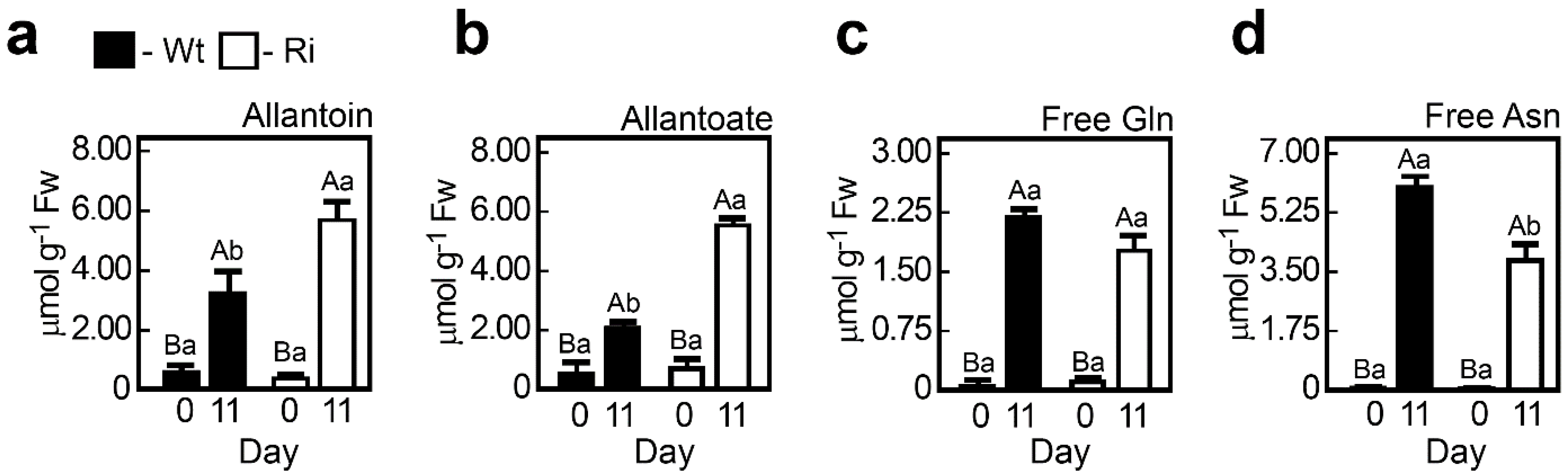 The levels of the ureides (a) allantoin and (b) allanoate and the amides (c) glutamine (Gln) and (d) asparagine (Asn) in wild-type (Wt) and SO RNA interference mutants (Ri) plants. Plants were grown under normal growth conditions (0 day) or after being exposed to eleven days of extended dark stress (11 day). The bars are the average values ± SE (n = 3–10). The values denoted with different letters are significantly different according to the Turkey-Kramer HSD test (JMP 8.0 software, [37]; p < 0.05). Different lower case letters indicate differences between SO mutant and wild-type plants within the same treatment. Different upper case letters indicate a significant difference within the plant genotypes in response to treatment. The data for SO-compromised plants represent the mean for SO Ri 131 and SO Ri 421 mutants.