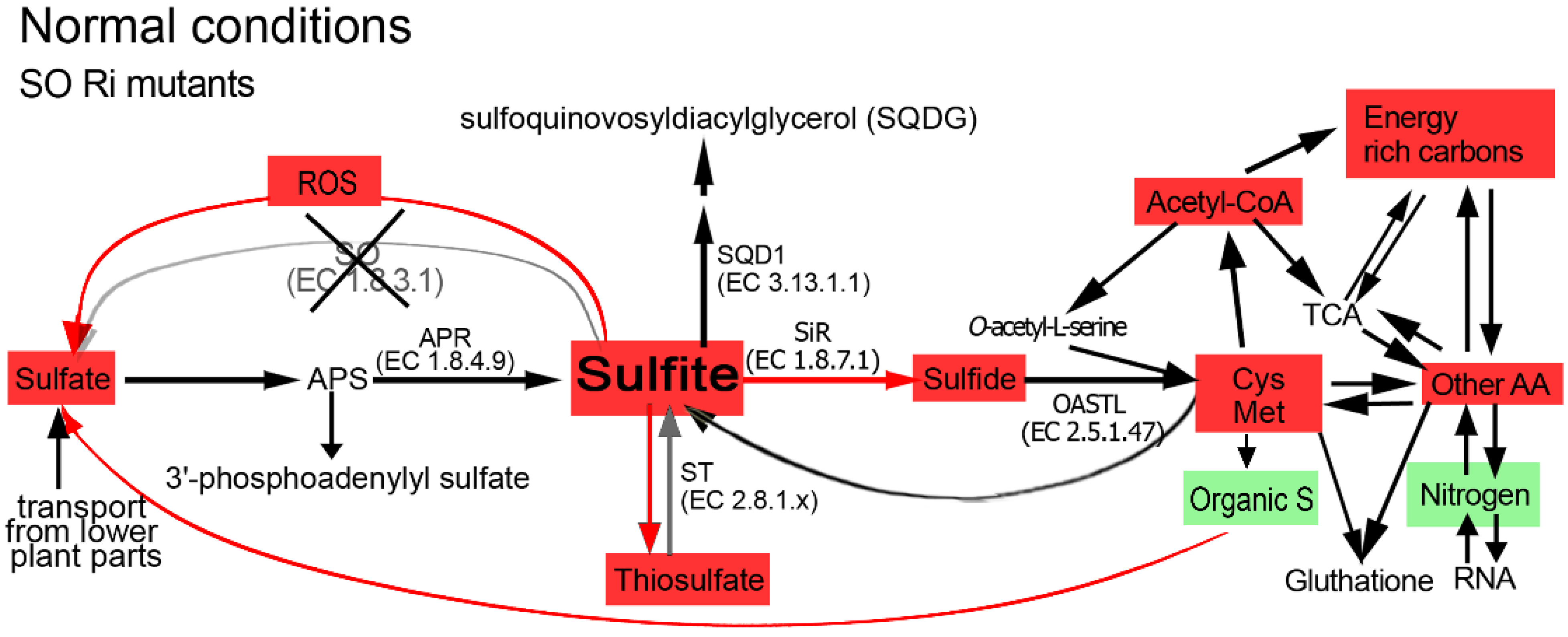 The level of sulfate was significantly higher in the SO mutant top leaves as compared to the top leaves in the unstressed wild-type plants (Figure 1 and Figure 7, here and Supplementary Table S1 in [14]). What can be the cause of the higher sulfate in mutant plants with impaired sulfite oxidase activity? Considering the similar total sulfur levels detected in both wild-type and SO mutant top leaves (Figure 1, Supplementary Table S2 here and Supplementary Table S1 in [14]), this can be attributed to the following: (i) the high ROS levels in mutant leaves (Supplementary Figure S3) that could participate in the oxidation of the excess sulfite to sulfate [25] and/or (ii) the product of organic-S metabolites enhanced degradation in the SO-impaired plants (Figure 7).
