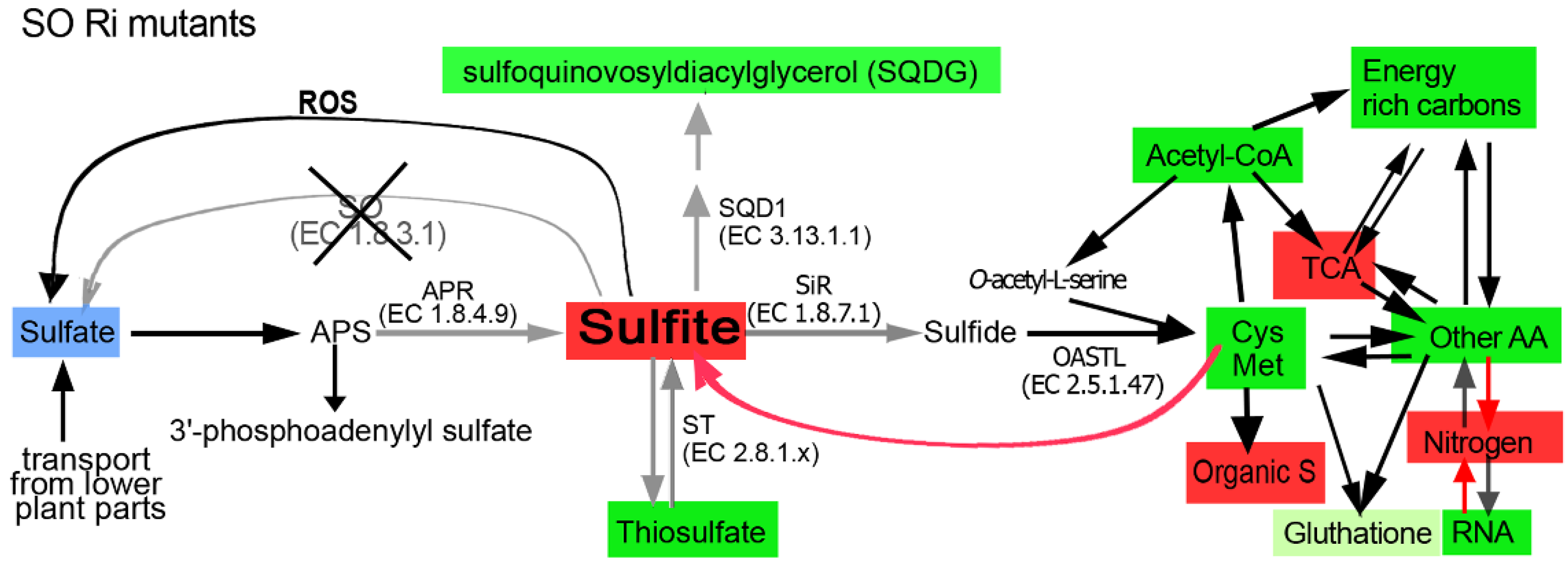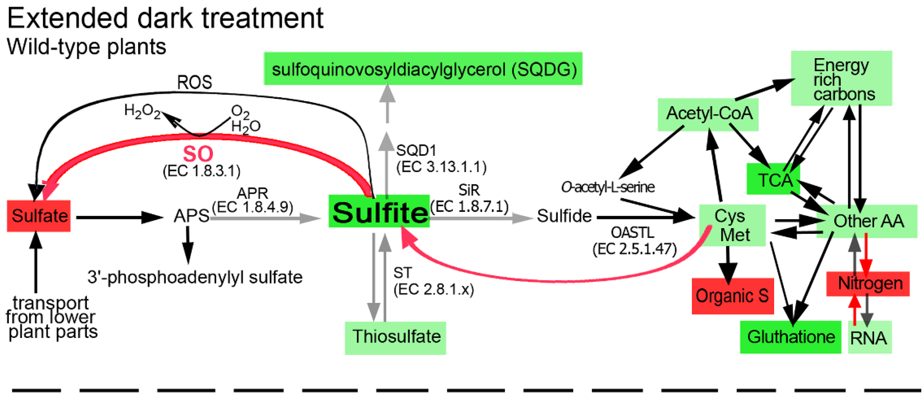 Schematic illustration describing the impact of sulfite oxidase (SO) impairment on the sulfur, carbon and nitrogen metabolism in the top leaves of tomato plants grown for 11 days in dark. Abbreviations are: adenosine-5′-phosphosulfate (APS), APS reductase (APR), sulfite reductase (SiR) O-acetyl-serine-thiol-lyase (OAS-TL), UDP-sulfoquinovose synthase (SQD1), sulfite oxidase (SO), sulfurtransferases (ST). The Cys Met box indicates the sum of total Cys and Met. The other AA indicates the total detected amino acids other than Cys and Met. Energy rich carbon indicates fatty acids, sucrose, fructose, sorbitol and myoinosytol. TCA indicates pyruvate and the following TCA cycle metabolites: citrate, α-ketoglutarate, succinate, fumarate and malate. Nitrogen indicates the total N as in Table 2. Organic S indicates total organic S as in Supplementary Table S2. ROS indicates the reactive oxygen species as in Supplementary Figure S3. The blue box indicates that the sulfate level was not affected by the stress but was significantly lower in the mutant as compared with the stressed wild-type top leaves [14]. Red or green colors indicate the enhancement or reduction, respectively, in metabolites, as compared to the contents in the unstressed top leaves of the wild-type plants (light green indicates less reduction compared to the darker green). The red arrow from the Cys Met box indicates the direction of sulfite, the degradation product of these amino acids [14]. Red or grey arrows indicate the SO activity enhancement or decrease, respectively. The lack of colored metabolites or colored arrows indicates similar levels as compared to the unstressed top leaves of the wild-type plants.