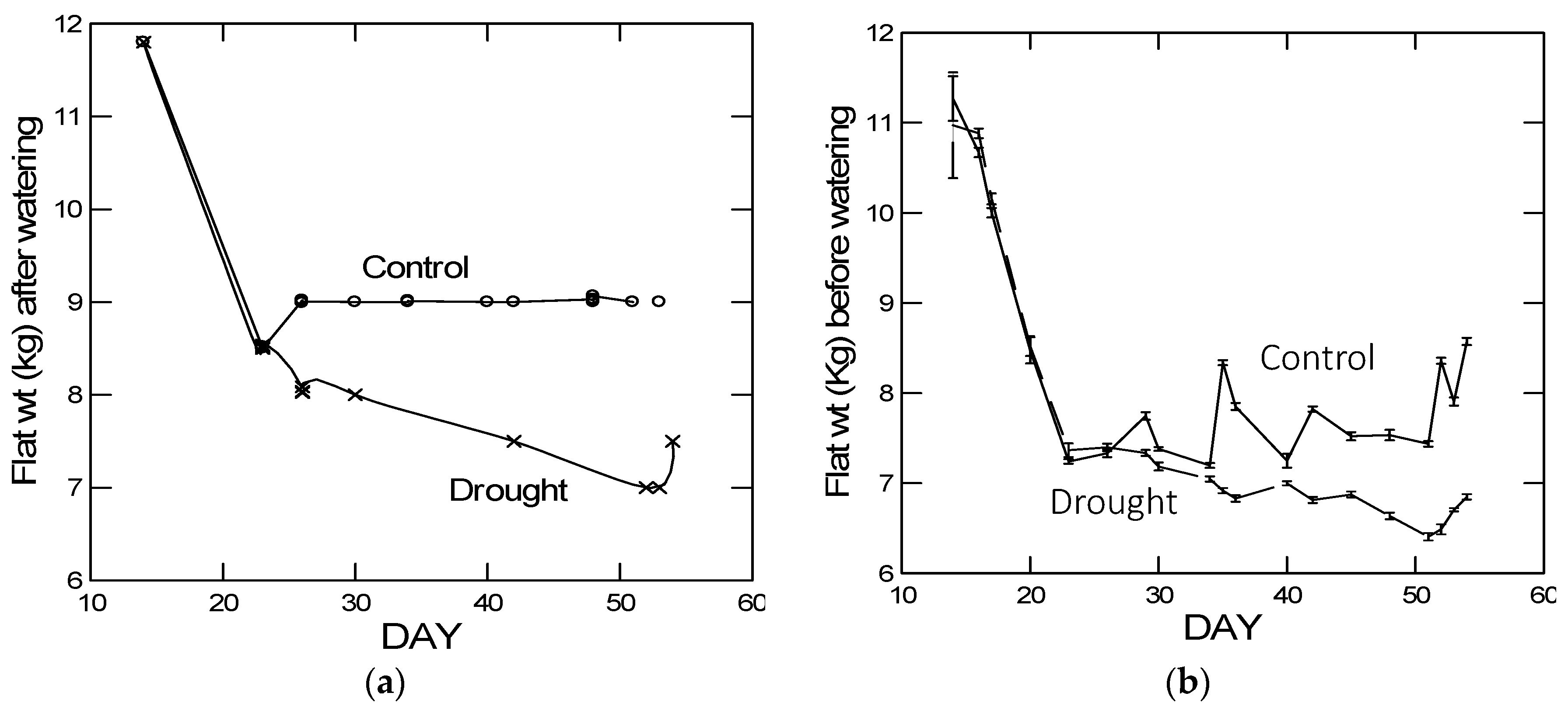 Flat weights (a) just after and (b) before or between watering for the control and drought treatments. All flats in each treatment were watered to the same weight, so there are no error bars for the after watering flat weights. For the before watering flat weights, error bars are ± 1SE across four flats for each watering treatment.