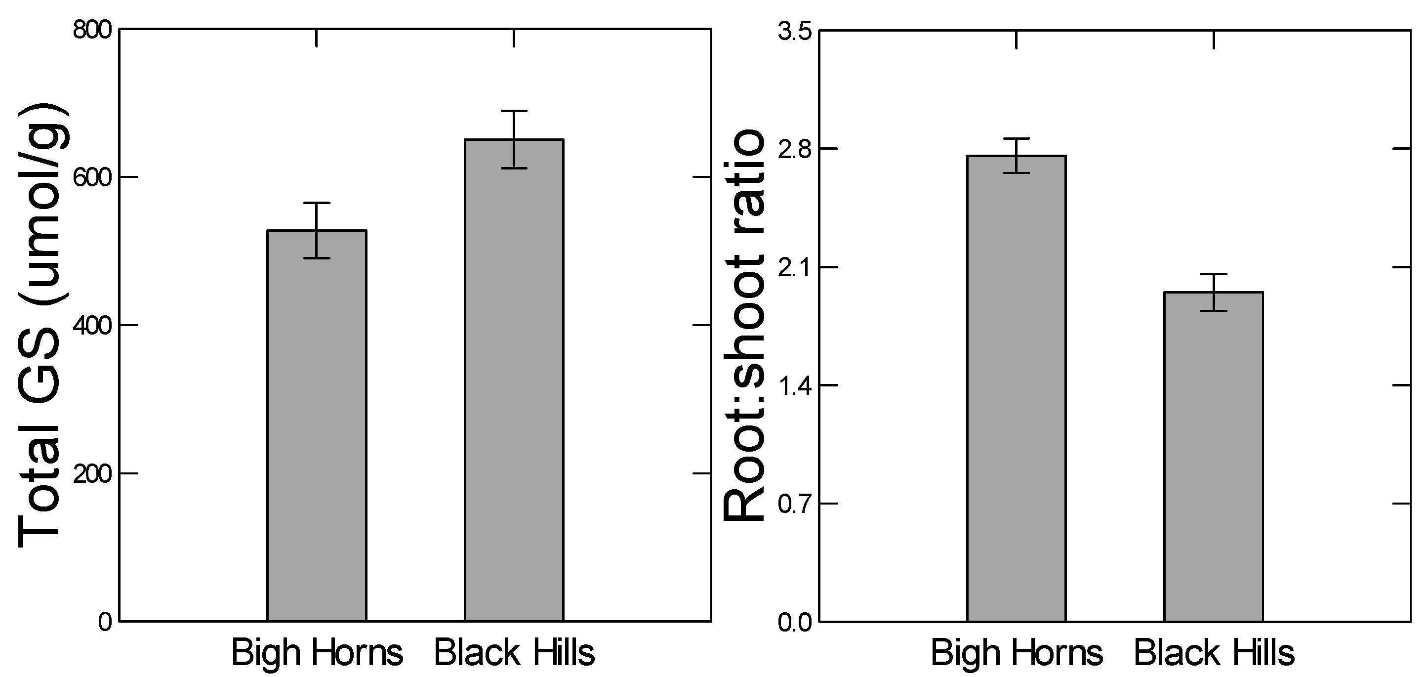 A negative correlation was also observed between smaller stomatal apertures, as indicated by less negative carbon isotope ratios, and GS levels (Figure S4). Interestingly, this pattern held for both BCGS and METGS, but the correlation was positive for GS ratio. In addition, these correlations were dependent on drought and herbivore treatments, the particulars of which differed between populations (Table 7) and probably lie within populations. For example, in the low elevation Black Hills population, the correlations were dependent on the presence of drought and especially herbivory. What caused these correlations? These correlations may be dependent on the area of leaf tissue consumed, which we did not record, but which presumably would have influenced water loss and stomatal behavior. Alternatively, these correlations may reflect interactions between hormone-mediated response pathways.