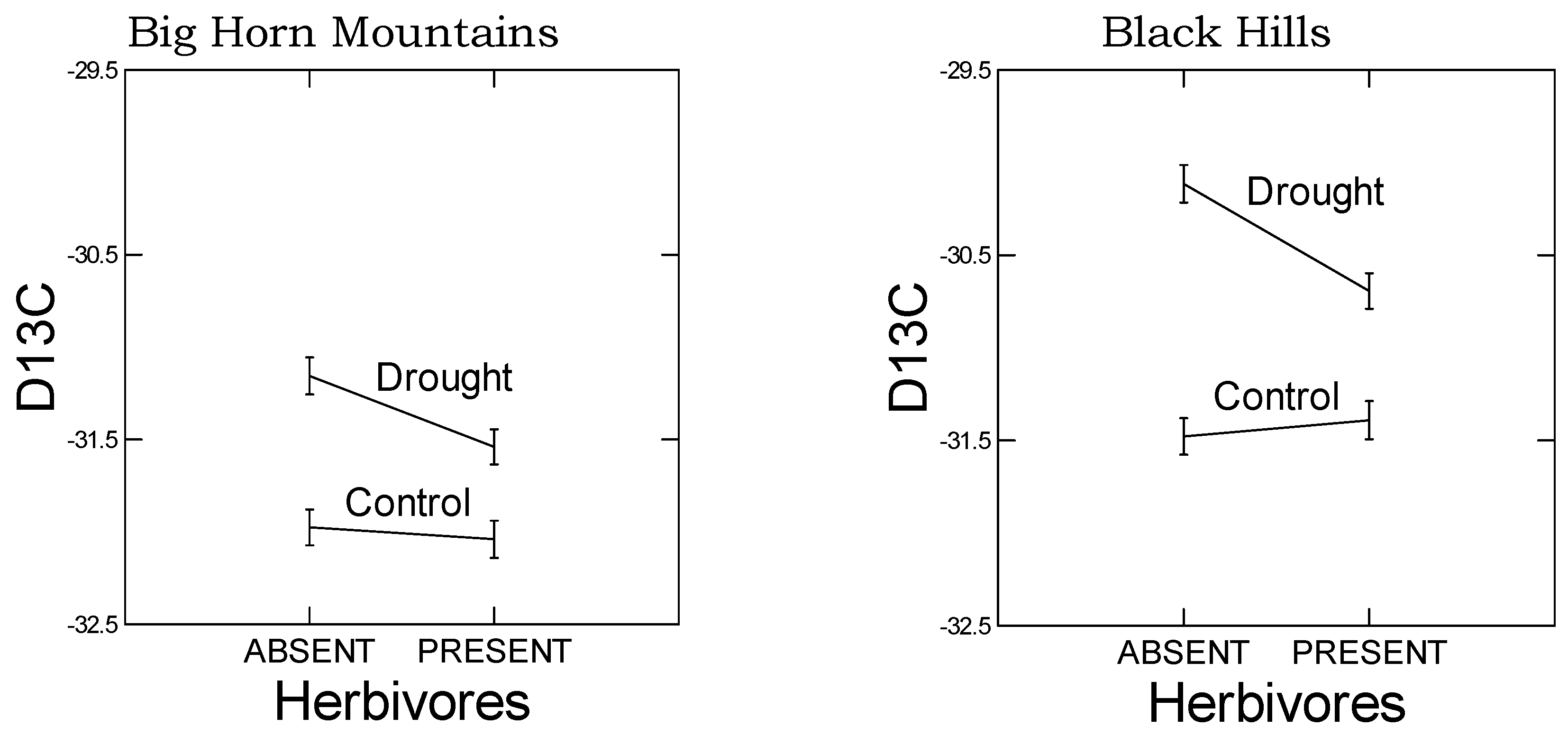 In a separate analysis of the carbon isotope ratio (D13C, Table 5B), a main component of PC1, there was a significant effect of herbivory, but only in the drought treated plants (Figure 3). The effect of herbivory was to decrease D13C in the drought treated plants, an effect that was more dramatic in the Black Hills population (Table 5B, environmental treatments-by-population line interaction: F9, 95 = 3.114, p = 0.003).