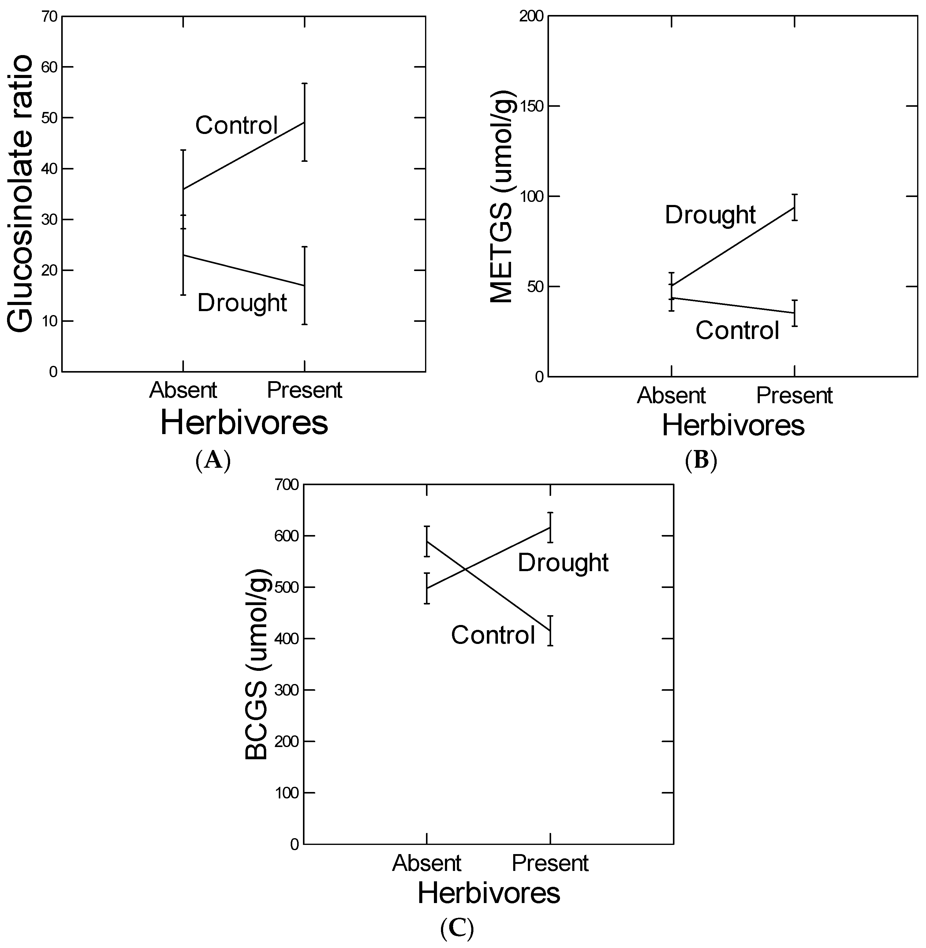 Our predictions were based on the existence of antagonistic defense and abiotic stress tolerance plastic responses in B. stricta, as has been well documented in Arabidopsis [20]. Specifically, we checked whether a glucosinolate defense response to the generalist insect herbivore S. exigua was negatively affected under conditions of water deficiency. The assumption that we made was that under drought conditions, ABA signaling would interfere with JA/ET signaling to attenuate herbivore-induced defense responses [14]. We found that an herbivore-induced GS ratio (BCGS/METGS) response was attenuated under conditions of drought. The BCGS/METGS ratio has been shown to cause resistance to generalist insect herbivores in B. stricta [19,31] and therefore may be the most relevant GS response variable. That is, in these other studies, this GS ratio in B. stricta has been fine mapped, and candidate genes have been transformed and near isogenic lines created and tested with positive results. Interestingly, feeding by S. exigua caused GS concentrations to decrease, which was reversed under drought (Figure 4; Note, BCGS and total GS concentrations are highly correlated r = 0.98 because of the relative abundance of BCGS). Because increased GS concentrations render plants more susceptible to specialists like flea beetles (e.g., [32]), we suggest that the plants responded to feeding by increasing resistance to both generalists (by increasing GS ratio) and specialists (by decreasing total GS concentrations). If so, the drought treatments were antagonistic to herbivore-induced defense responses. To our knowledge, it is not known why the GS ratio is effective independent of total GS concentration.